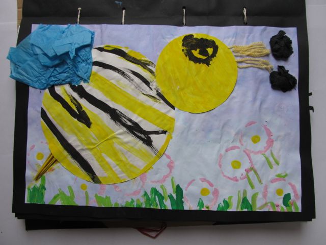 11 Il bambino incolla i due rotondi sul foglio acquerellato precedentemente ricomponendo l’ape.