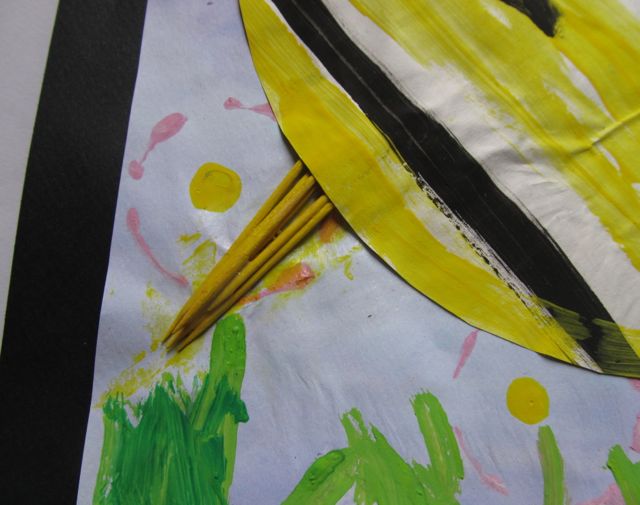 15. Colora degli stuzzicadenti con la tempera gialla e li incolla sul sederino dell’ape per creargli il pungiglione.