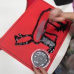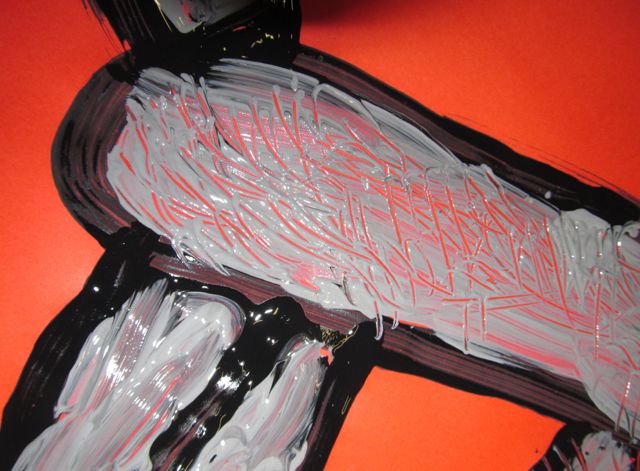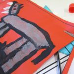 5. Con la tempera rossa realizza l’occhio e con la tempera nera aggiunge la pupilla.