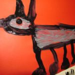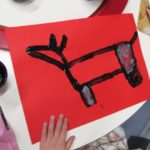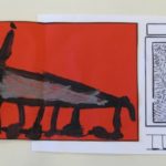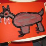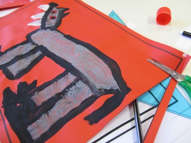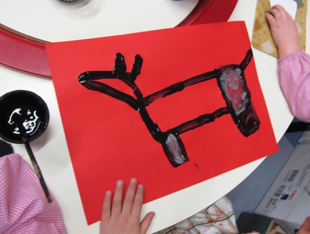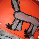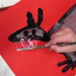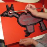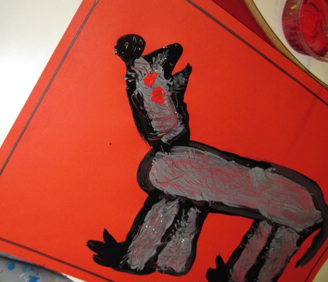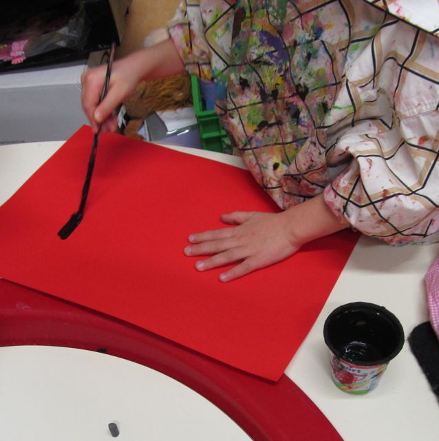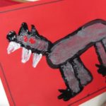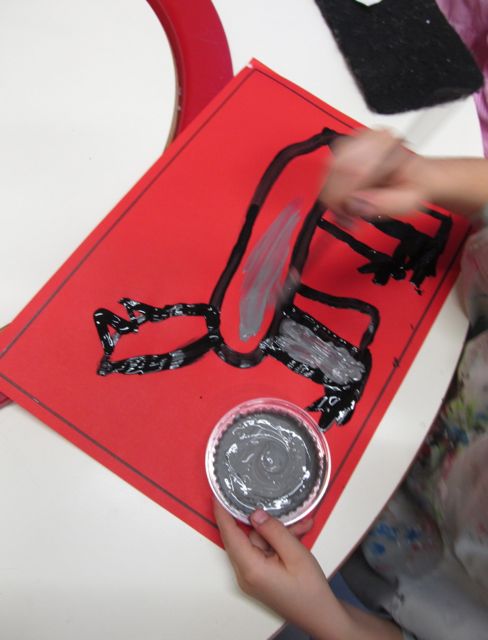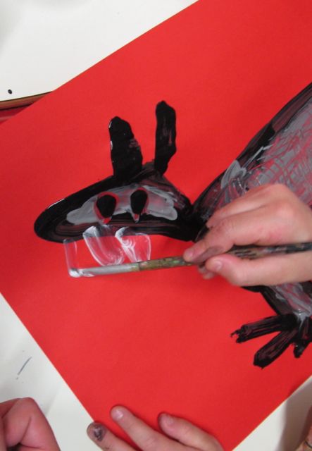 2. Il bambino con il pennello e la tempera nera realizza il contorno del lupo.