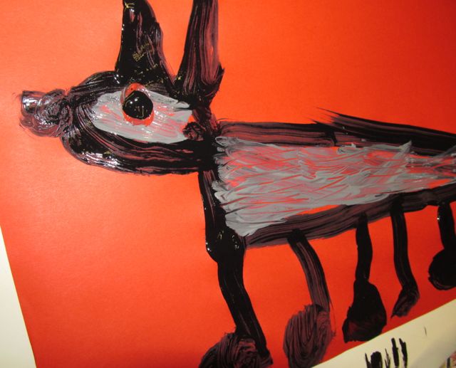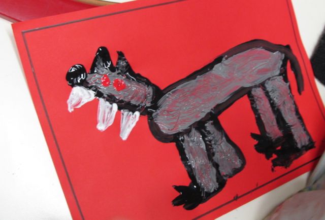3. Senza aspettare che asciughi, con un pennello più piccolo e della tempera grigia il bambino colora il lupo al suo interno.