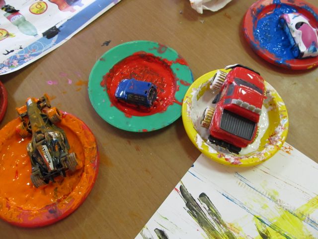 2.Ho posizionato all’interno di ogni piatto una macchinina (per avere vari tracciati ho cercato macchinine con ruote di forme e dimensioni diverse)