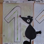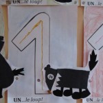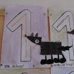 4° Repasser avec le feutre le numéro 1, colorier avec les pastels gras ce qui reste du papier et coller le loup à côté du numéro 1.