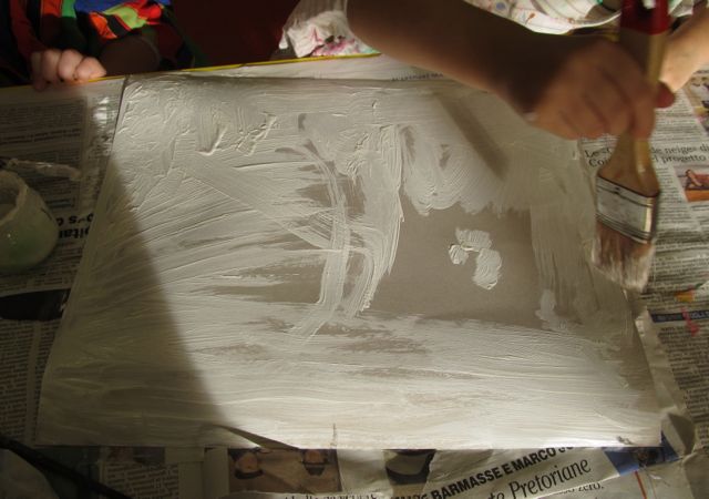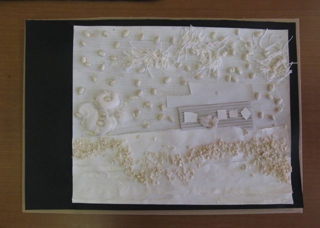 4. Les enfants préparent la page en colorant, coupant, déchirant, collant les différents matériels sur un carton.