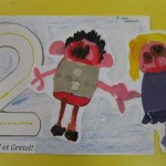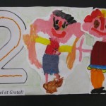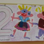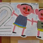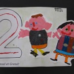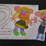 4° Repasser avec le feutre le numéro 2, colorier avec les pastels gras ce qui reste du papier et coller Hänsel et Gretel à côté du numéro.
