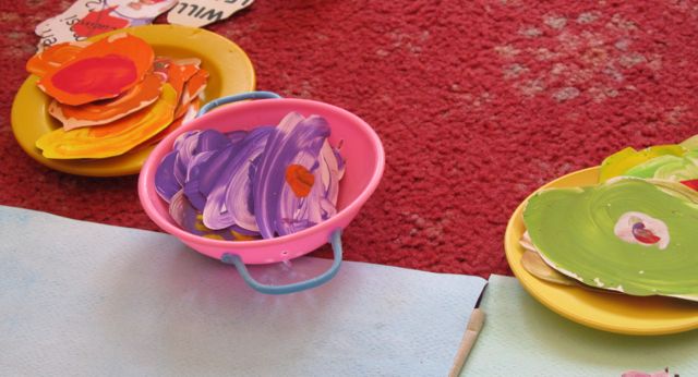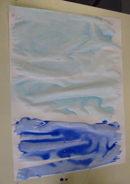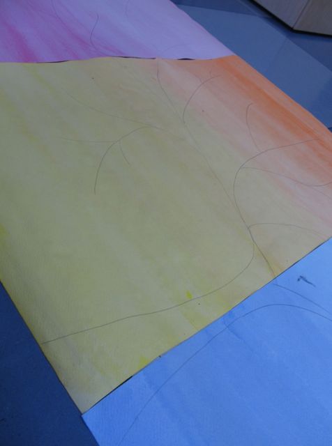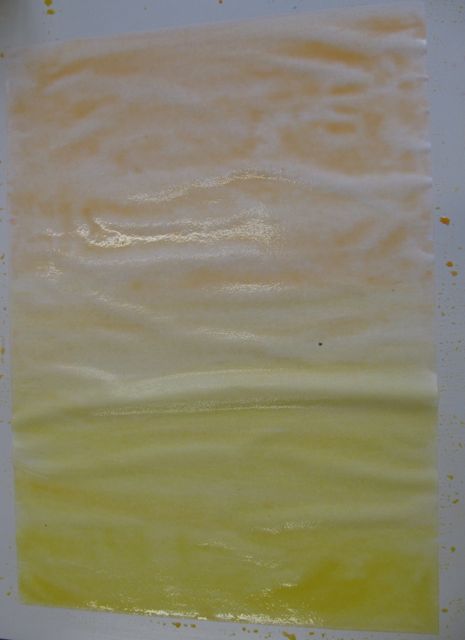 4. Les enfants peignent avec l’aquarelle ou de la gouache bien diluée quatre papiers: jaune-orange / azur-bleu / vert claire-vert foncé / rose claire-fucsia.