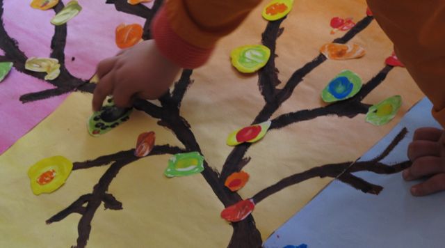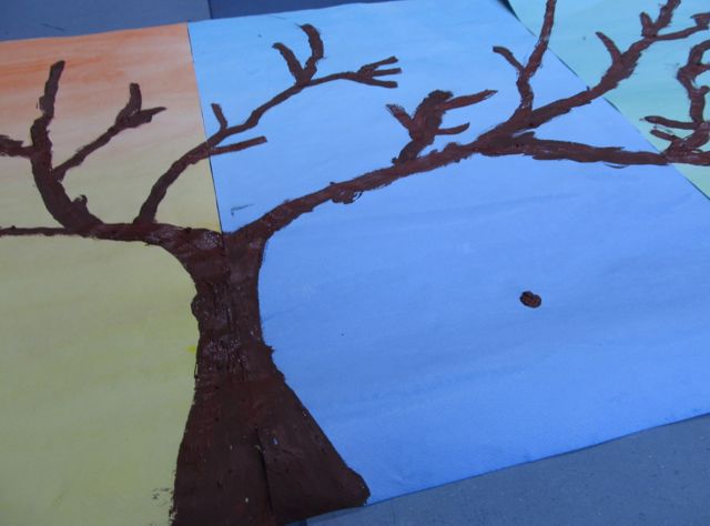 7. Les enfants colorient l’arbre en utilisant de la peinture marron/noire.