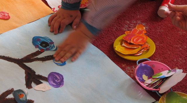 1. L’enfant dessine des ronds sur un papier blanc, avec la gouache et les doigts.