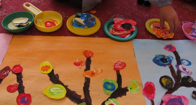 Observation: Pendant le coloriage et le collage des fleurs sur l’arbre, j’ai joué avec les enfants à nommer et/ou à deviner les couleurs qu’on utilisait.