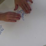 Attention: On doit effectuer cette opération parce que si l’enfant trempe directement l’éponge dans la gouache, l’éponge se charge trop de couleur et sur le papier ne reste pas la forme.