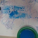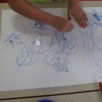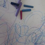 3. L’enfant trace des traits casuels en utilisant des pastels à la cire dans les couleurs azur, bleu, violet ou fuchsia.
