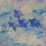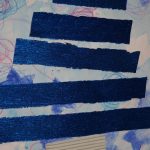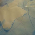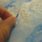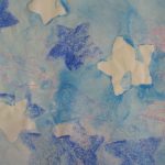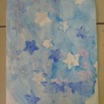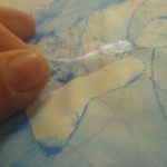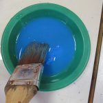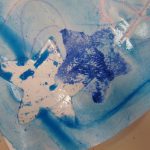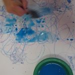 7. L’enseignant colorie l‘éponge avec un pinceau et de la gouache (non diluée) azurée, bleue et blanche, en créant des taches de couleur.