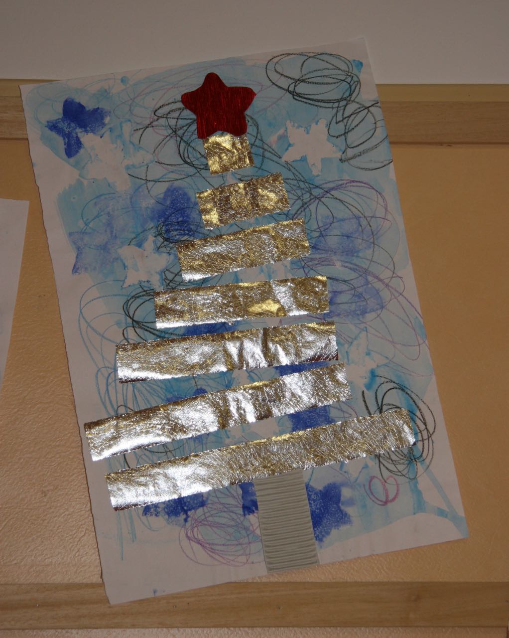 10. L’enseignant prépare une étoile dans du papier métallisé et un rectangle plutôt petit dans du papier ondulé blanc.