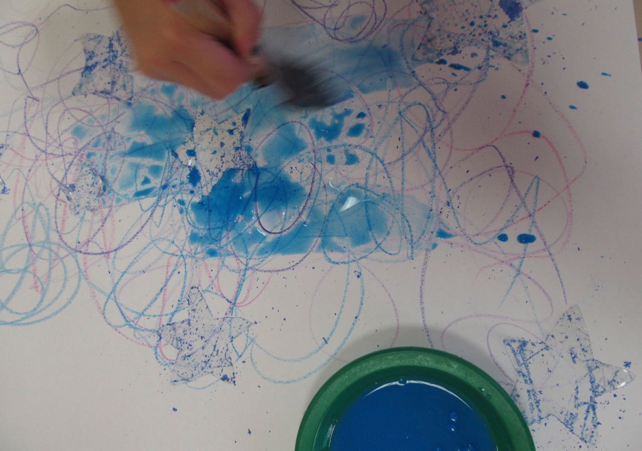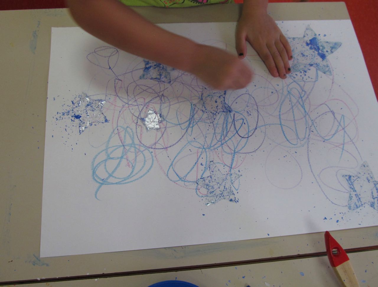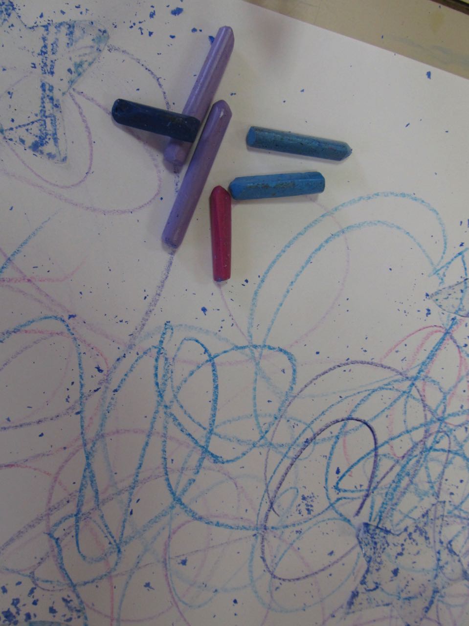 3. L’enfant trace des traits casuels en utilisant des pastels à la cire dans les couleurs azur, bleu, violet ou fuchsia.