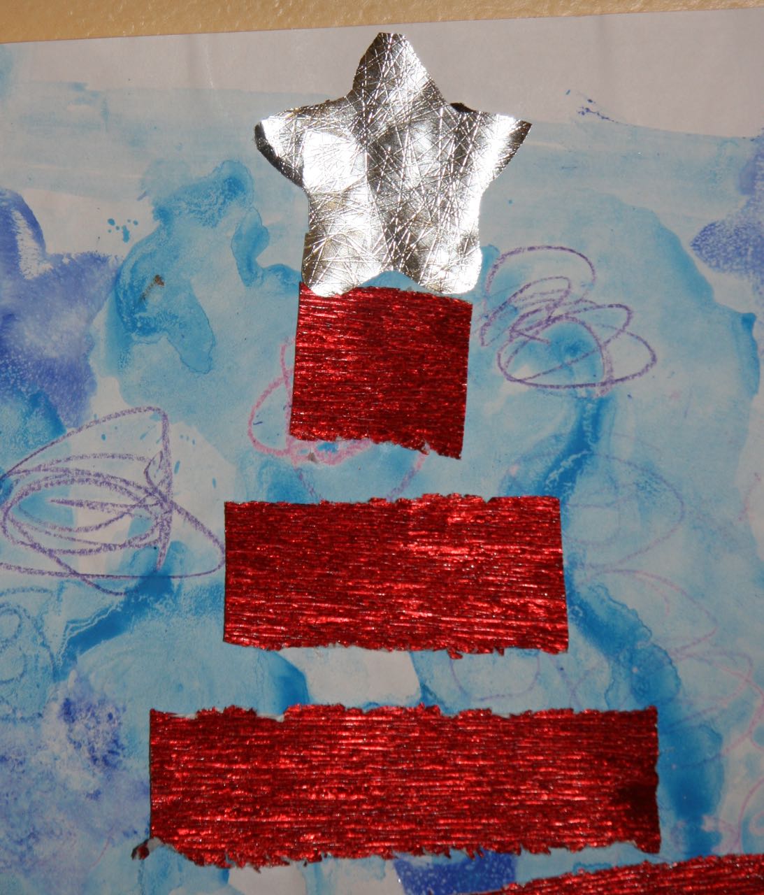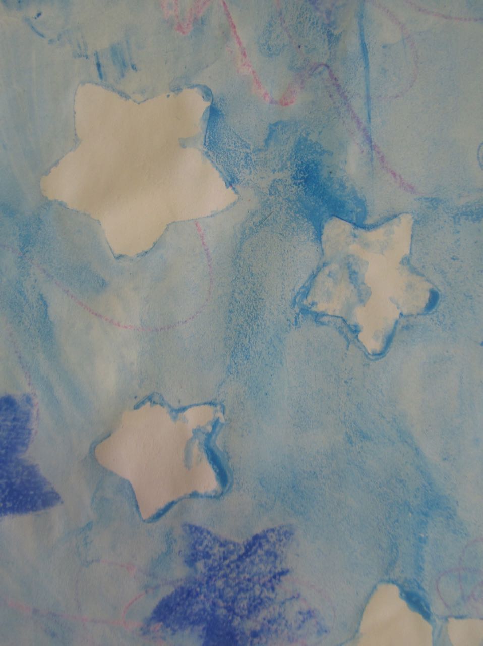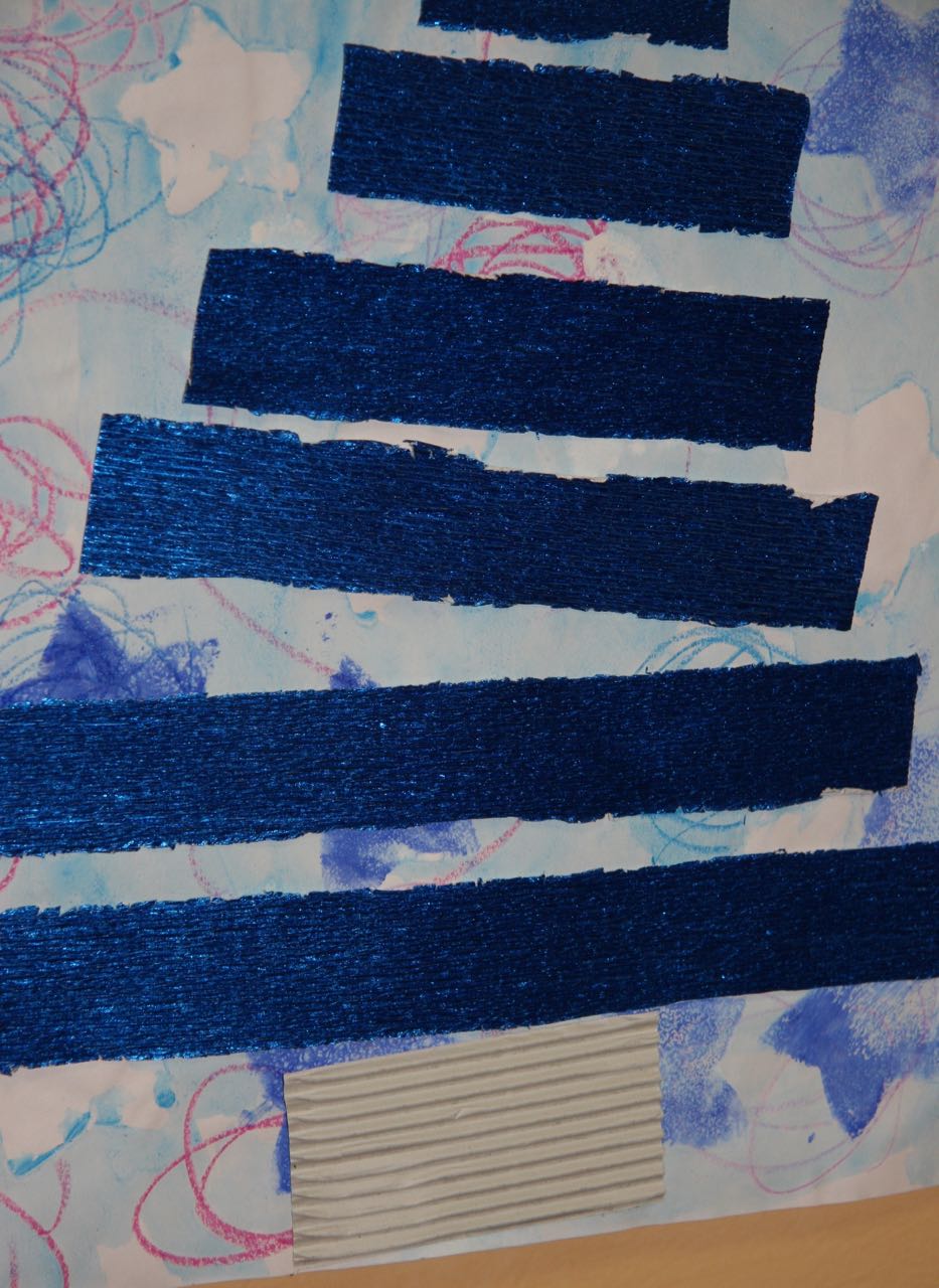 3. L’enfant trace des traits casuels en utilisant des pastels à la cire dans les couleurs azur, bleu, violet ou fuchsia.