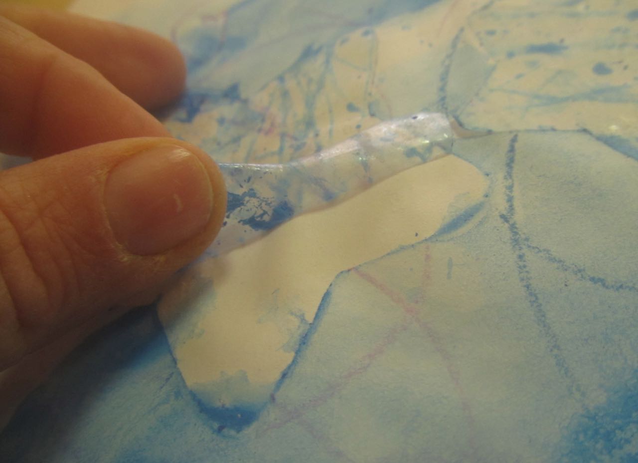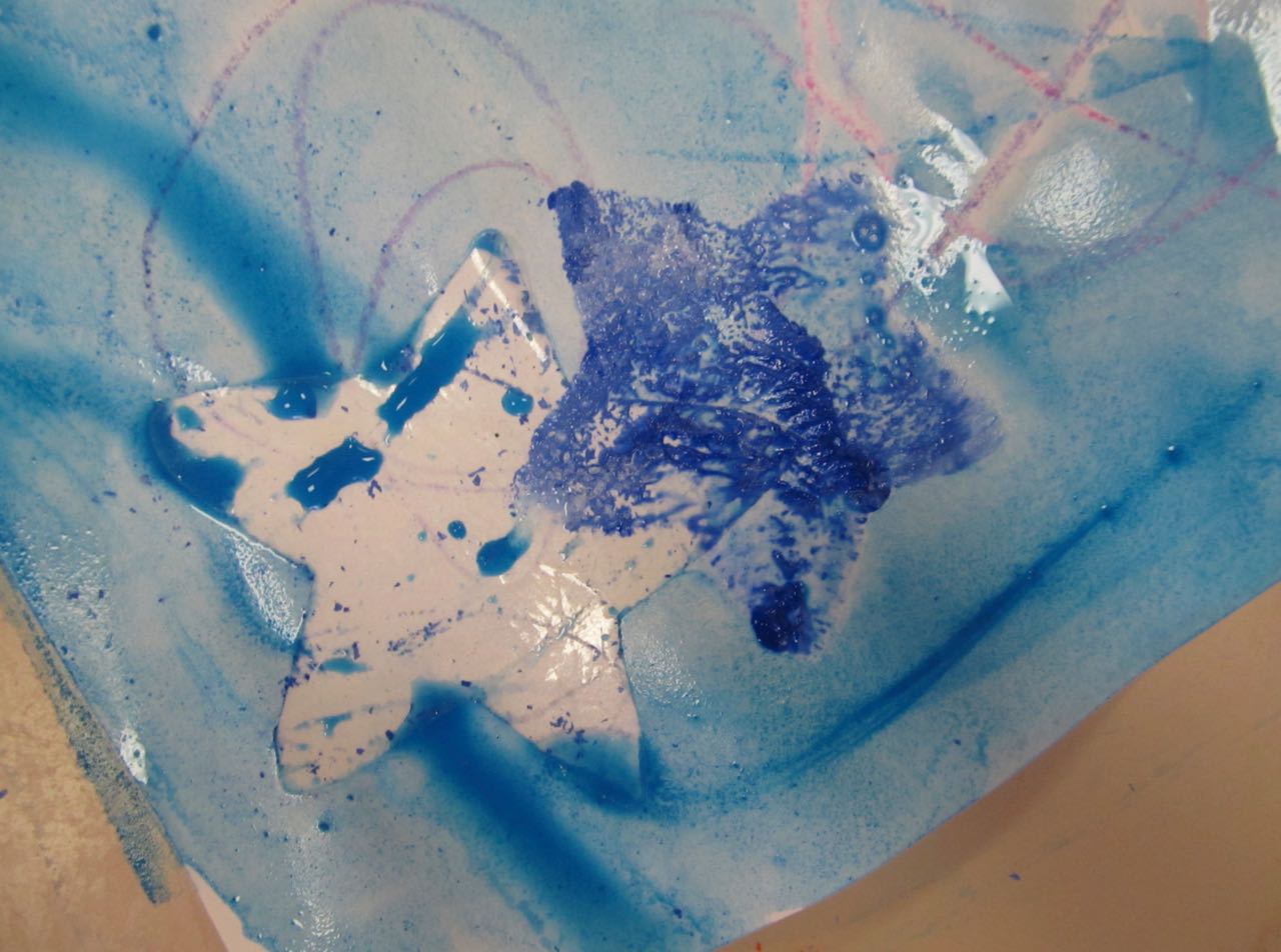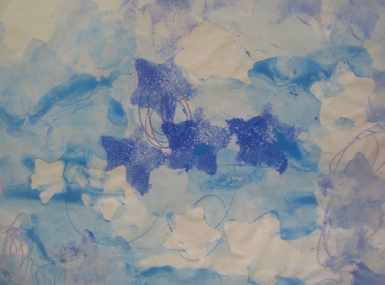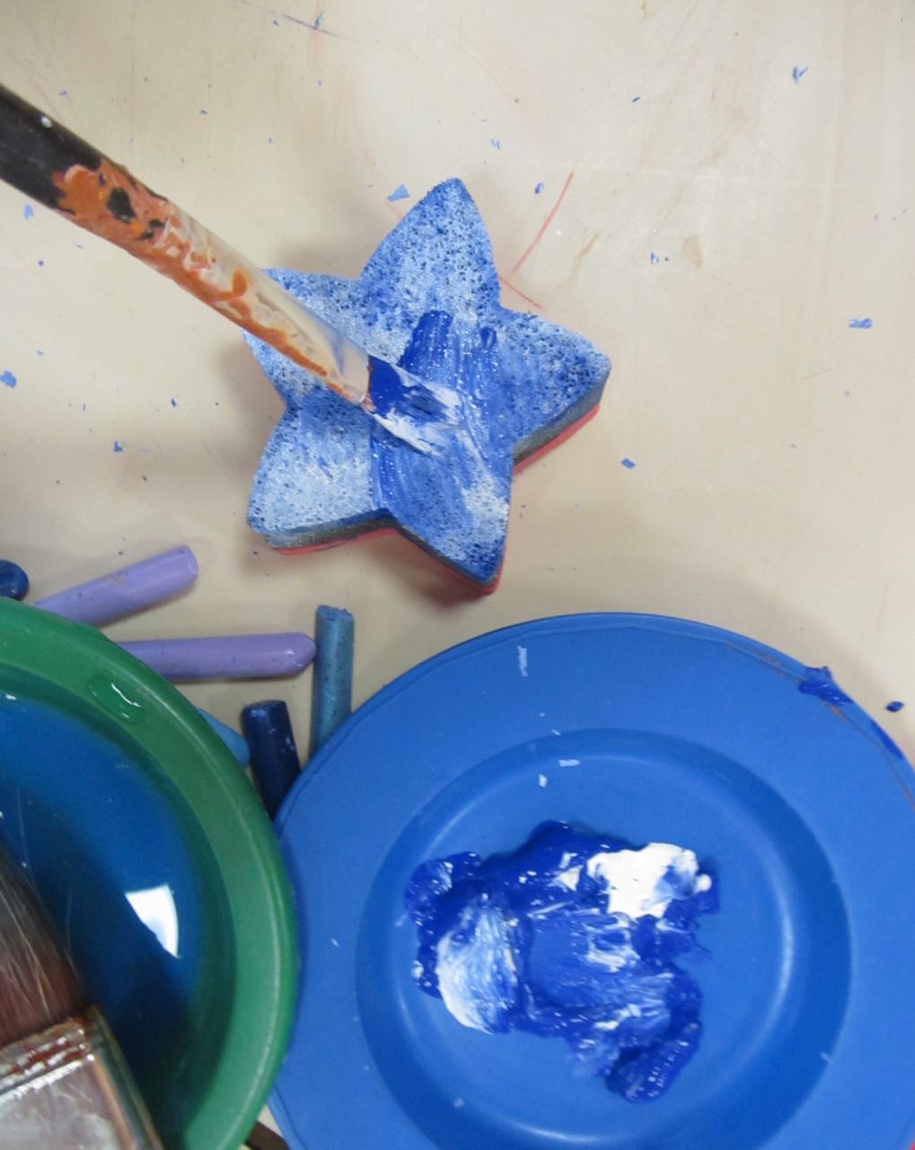 7. L’enseignant colorie l‘éponge avec un pinceau et de la gouache (non diluée) azurée, bleue et blanche, en créant des taches de couleur.