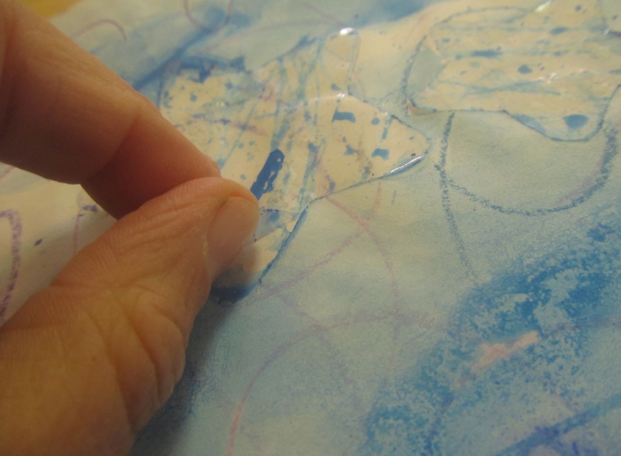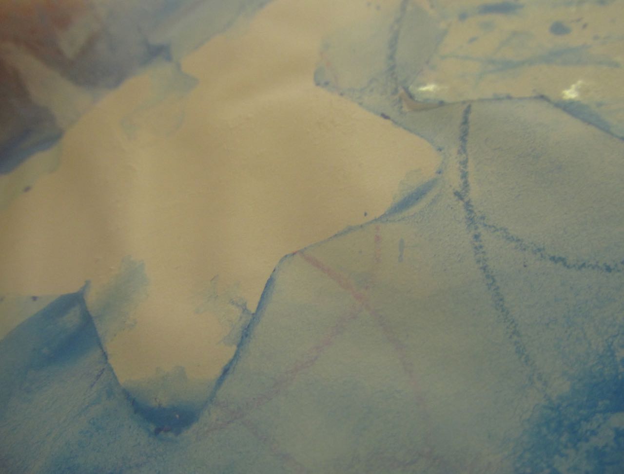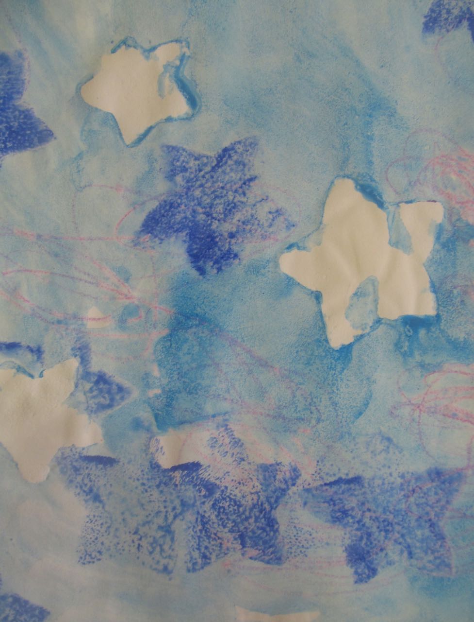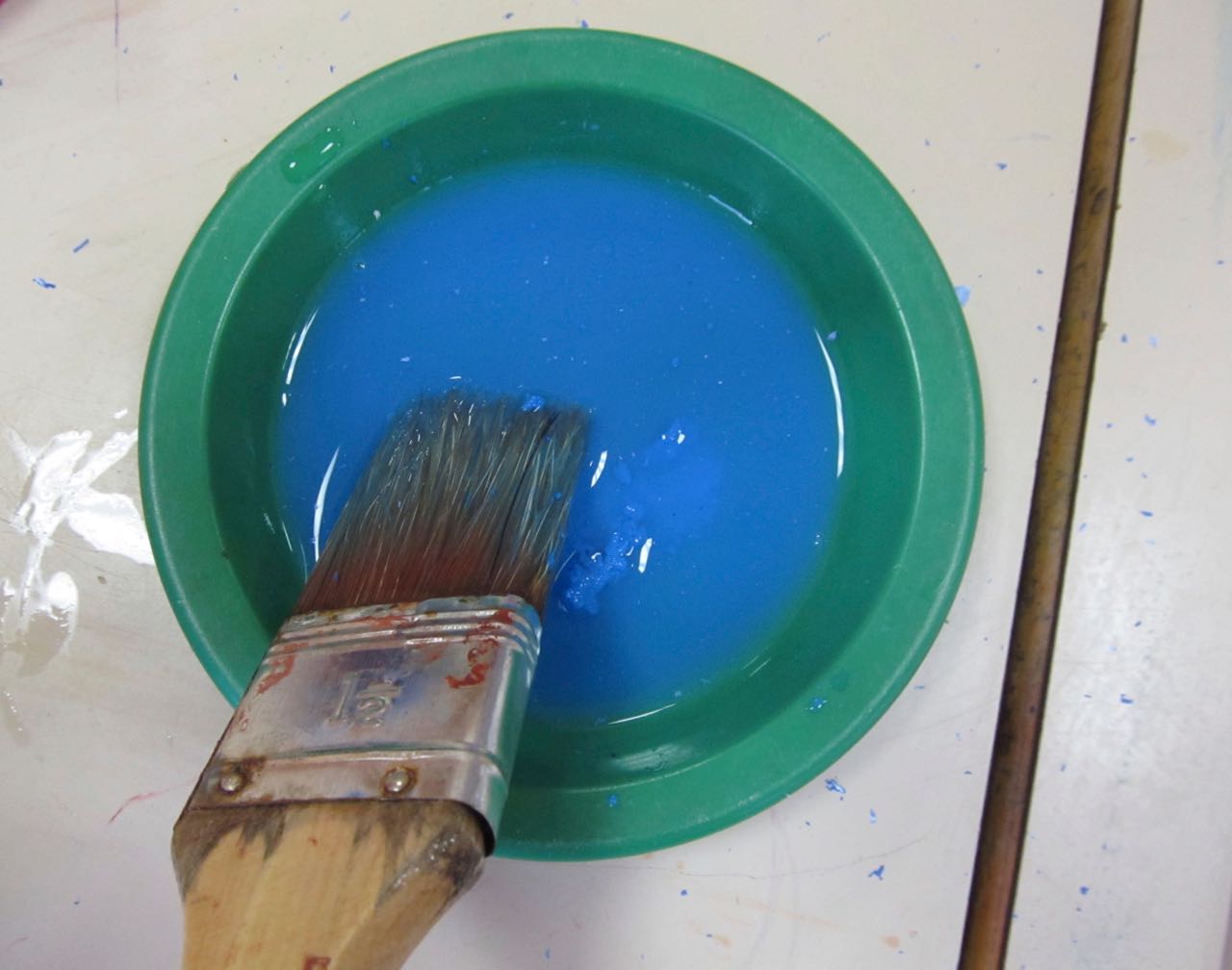 7. L’enseignant colorie l‘éponge avec un pinceau et de la gouache (non diluée) azurée, bleue et blanche, en créant des taches de couleur.