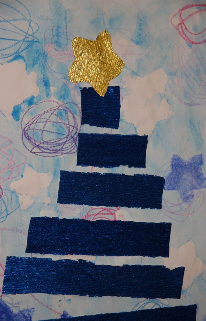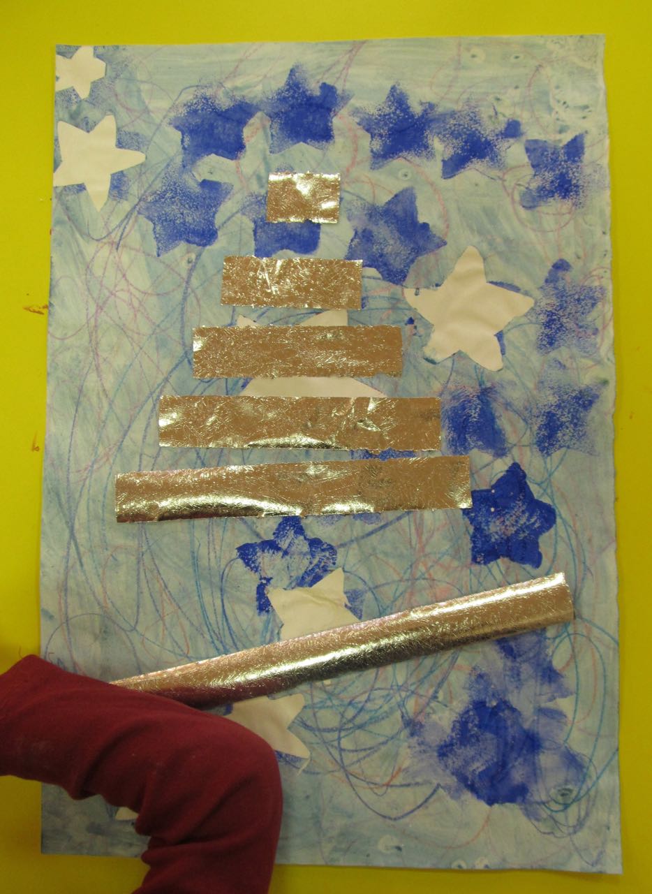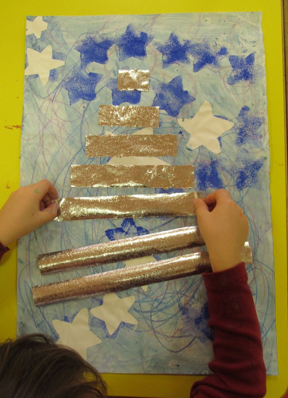 11. L’enfant colle, sur le papier qui a préparé avant, les rectangles en ordre croissant ou dégressif et réalise ainsi le sapin.
