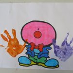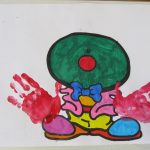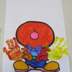 3. L’enseignant colorie les mains de l’enfant avec de la gouache. Avec ses empreintes l’enfant fait les mains du clown.