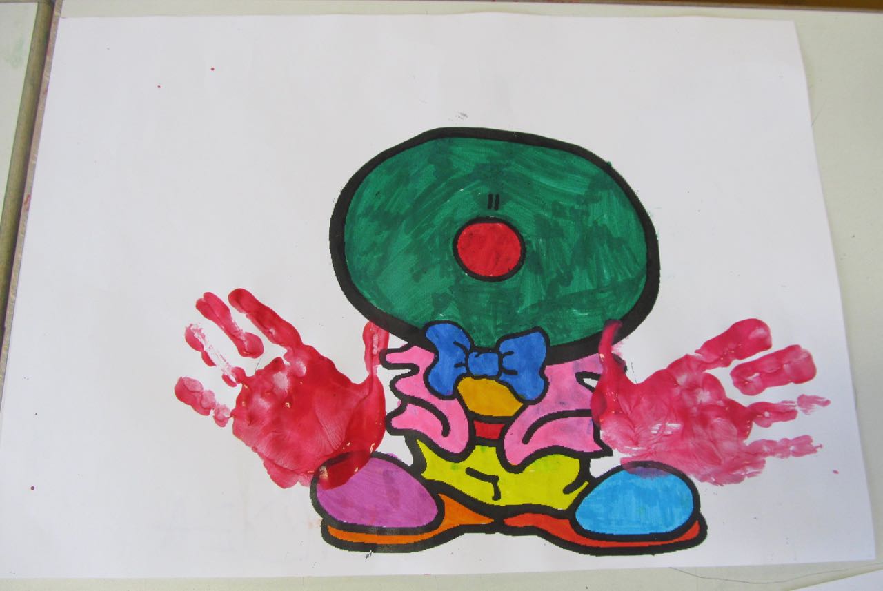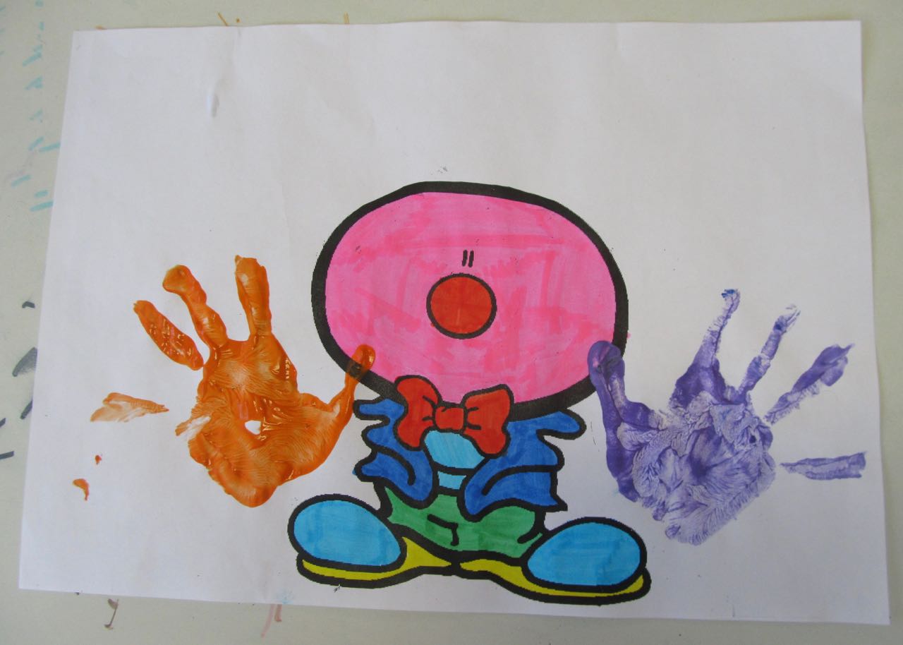 3. L’enseignant colorie les mains de l’enfant avec de la gouache. Avec ses empreintes l’enfant fait les mains du clown.