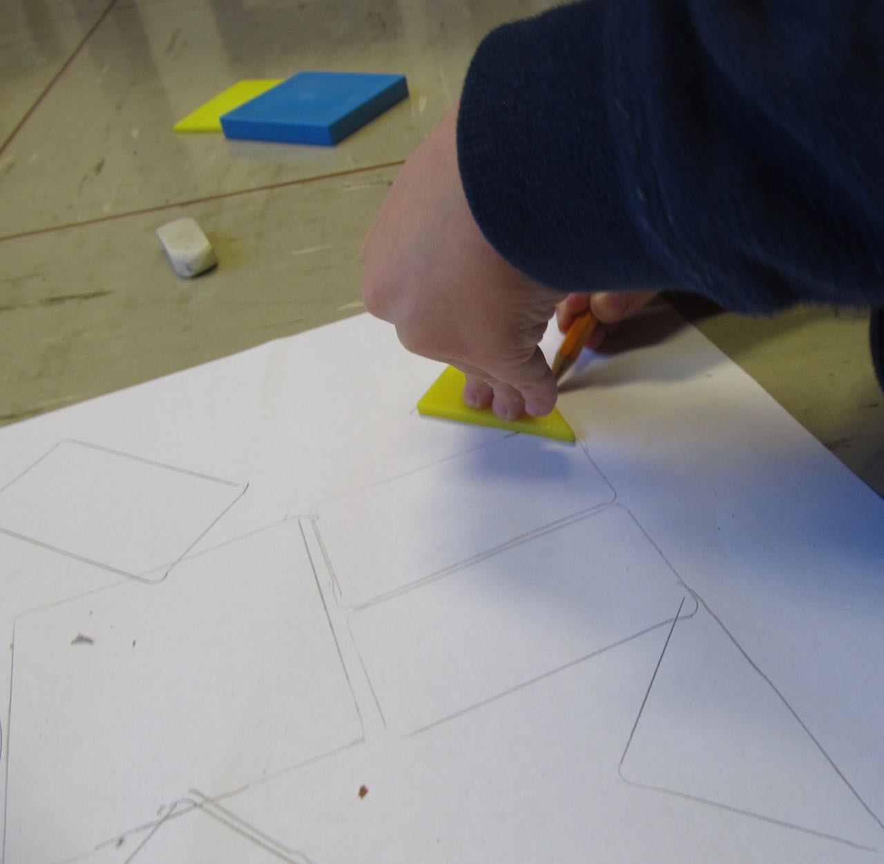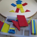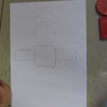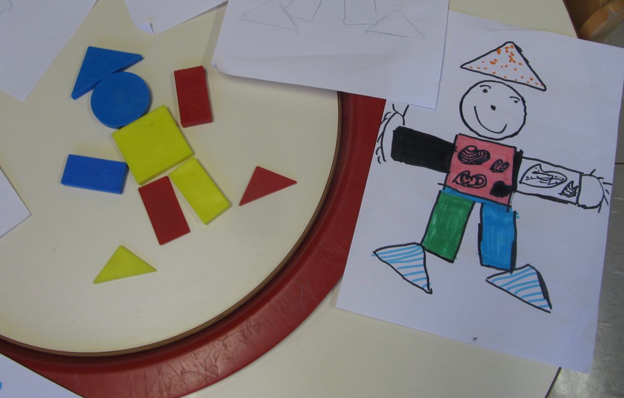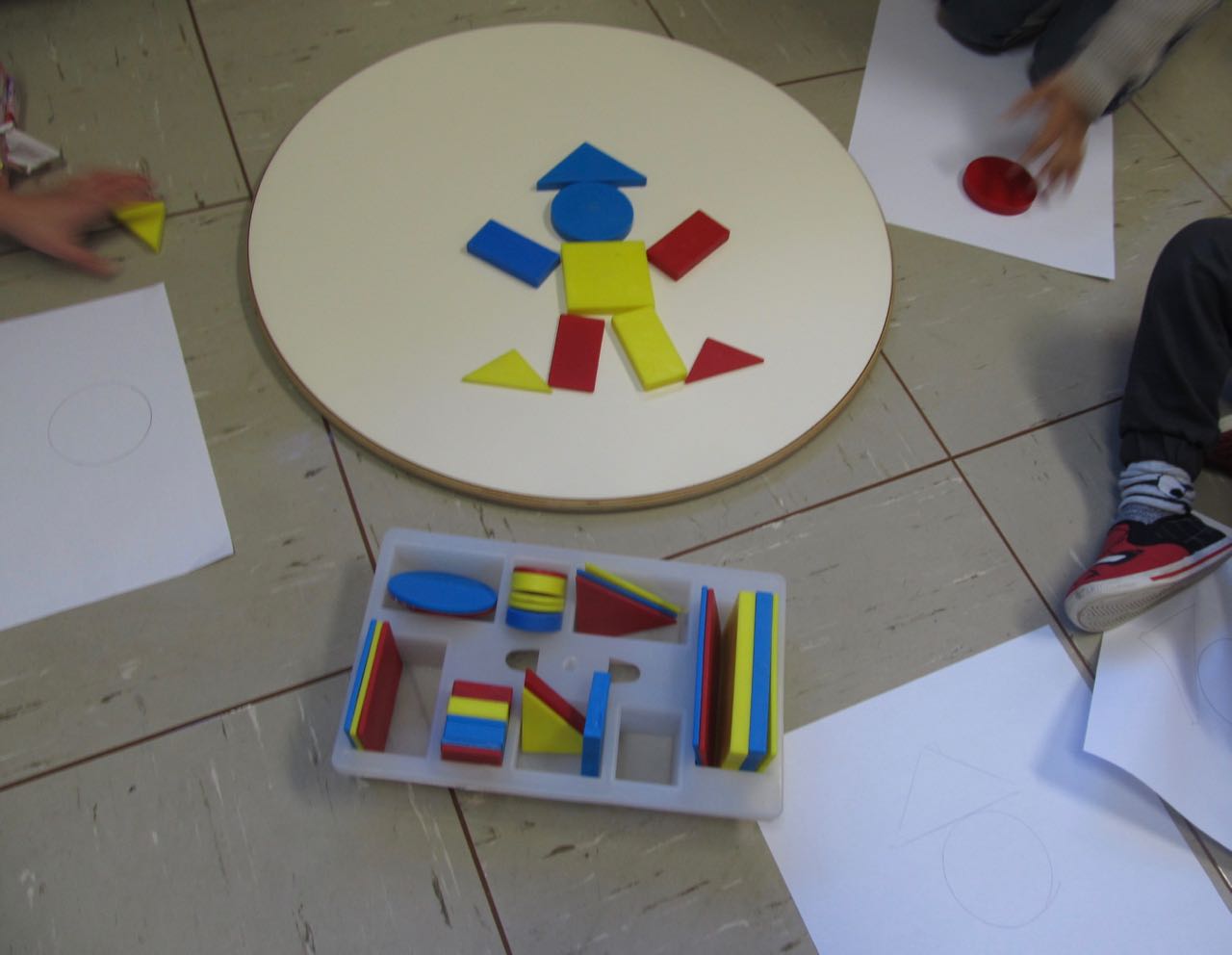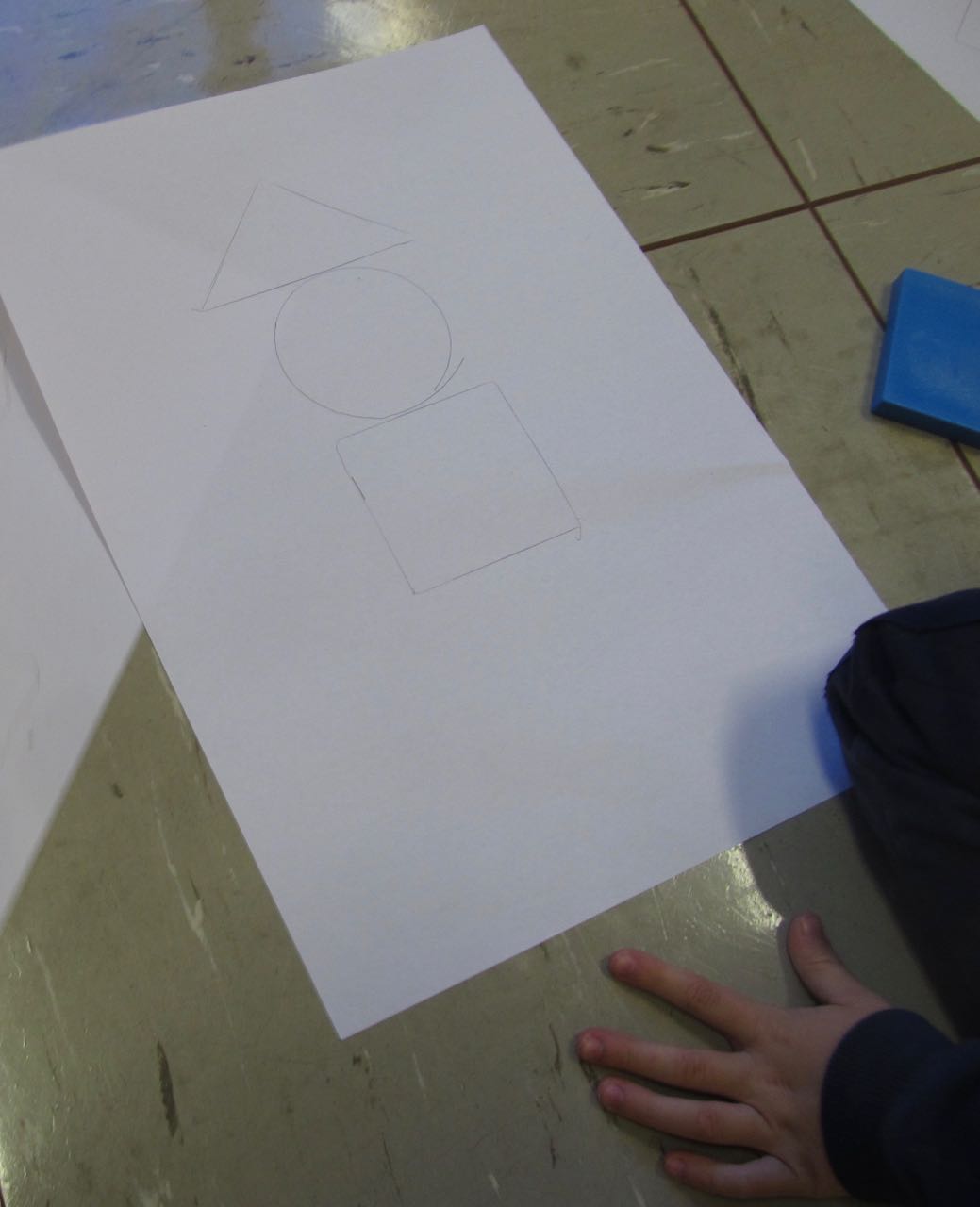 Pour faire cette opération, il cherche dans la boîte des blocs logiques les formes correspondantes au bonhomme et, à l’aide d’un crayon, il retrace leurs contours.