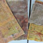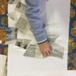 1. Il bambino pittura alcuni fogli di quotidiano con la tempera marrone chiaro/marrone scuro/giallo/bianco e delle spugne.