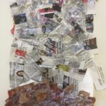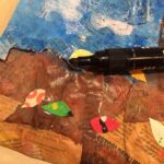 3. Il bambino strappa alcuni pezzi di giornale e li incolla in modo da ricoprire il cielo.
