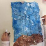 5. Con il rullo e la pittura azzurra/bianca colora il cielo.