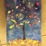 9. Il bambino incolla le foglie sui rami e qualcuna a terra come se fosse caduta.