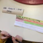 3. Il bambino ricopia la frase nelle strisce colorate a matita con un pennarello a punta fine nero.