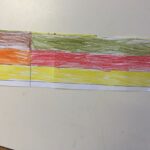 1. Il bambino colora con le matite colorate (gialle, rosse, verdi, arancioni, marroni) delle strisce (altezza 2cm., lunghezza 21cm.), tracciate su un foglio bianco.
