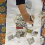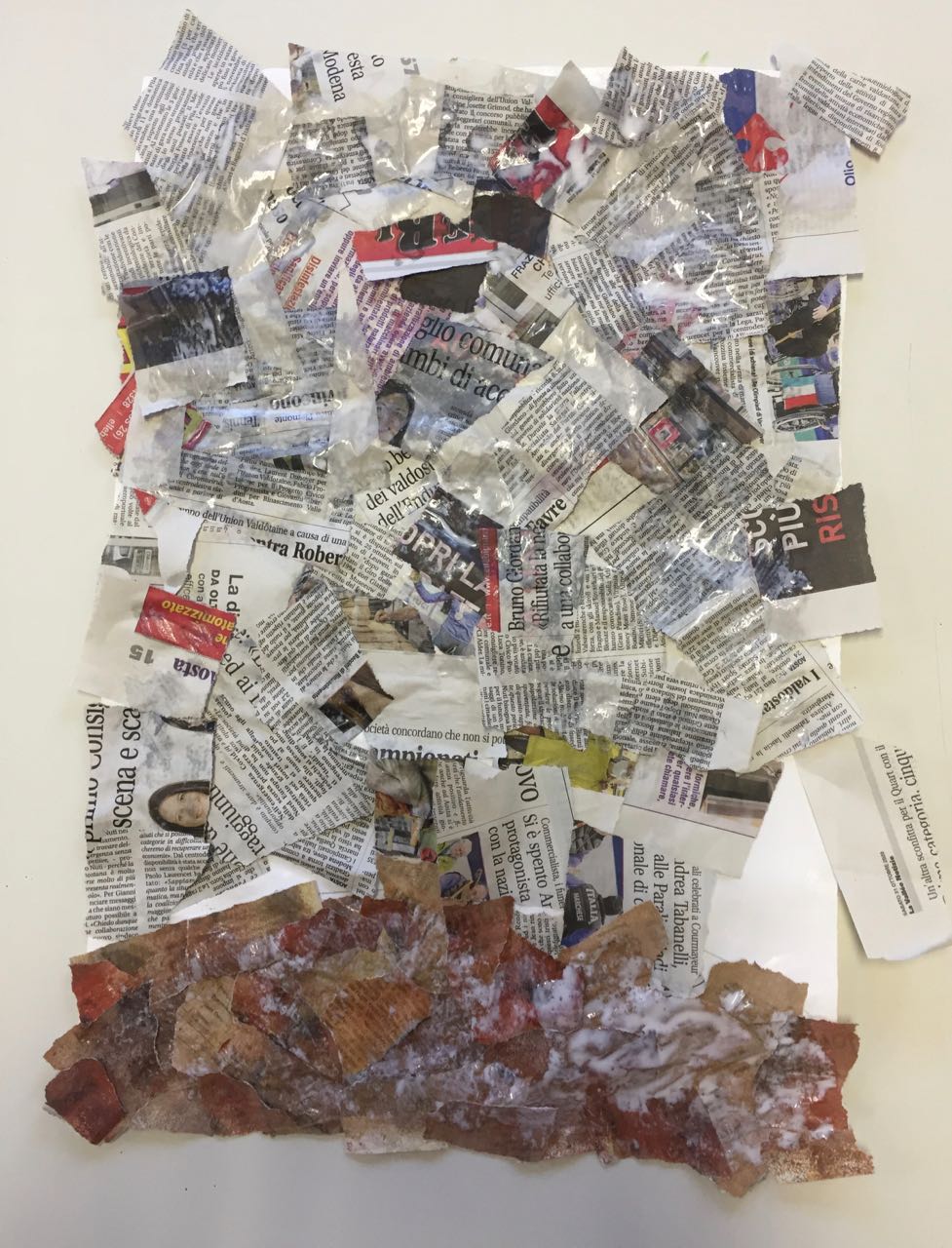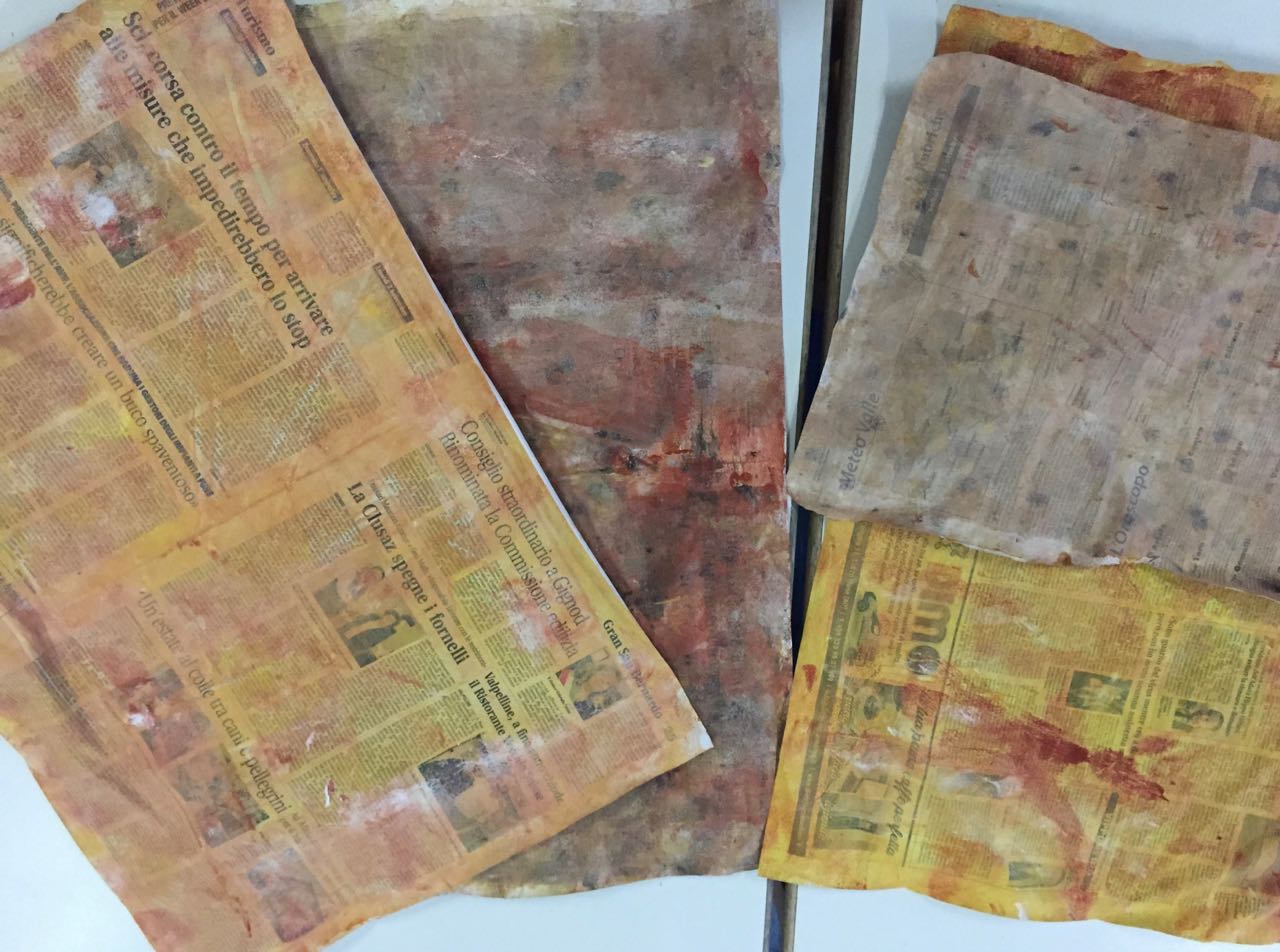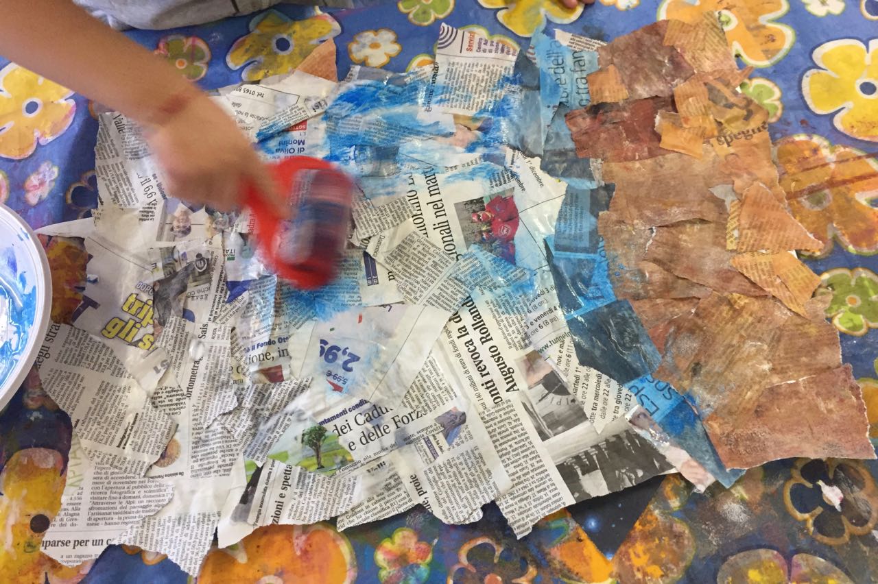1. Il bambino pittura alcuni fogli di quotidiano con la tempera marrone chiaro/marrone scuro/giallo/bianco e delle spugne.