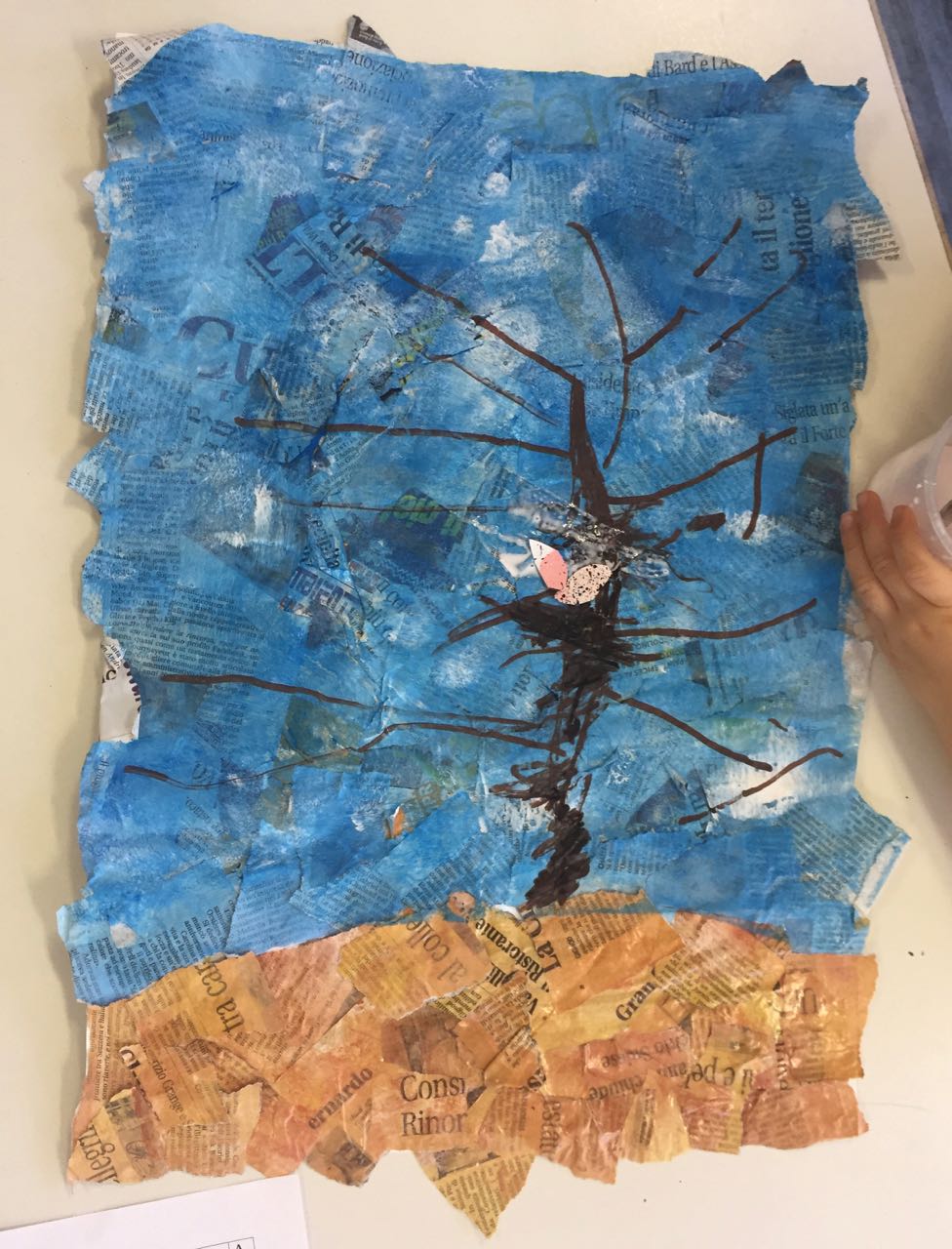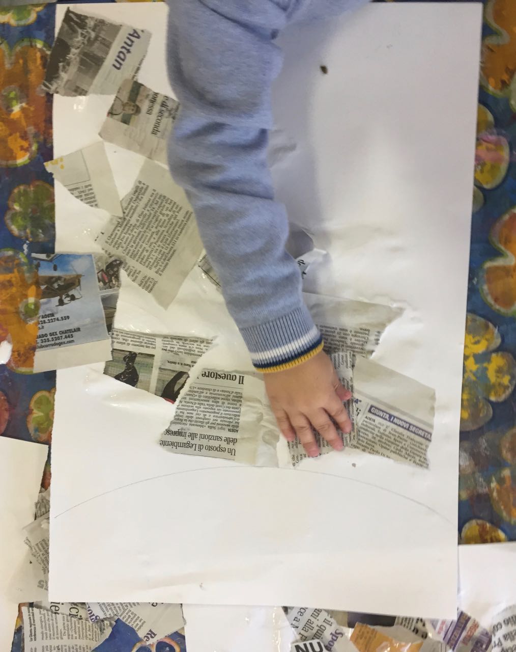3. Il bambino strappa alcuni pezzi di giornale e li incolla in modo da ricoprire il cielo.