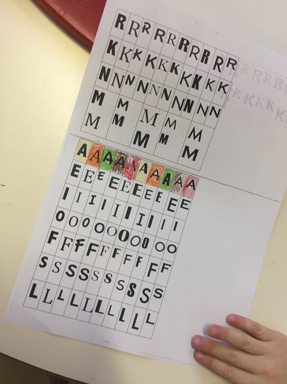 3. L’insegnante le ritaglia e tra queste inserisce qualche letterina diversa: l’ intrusa.