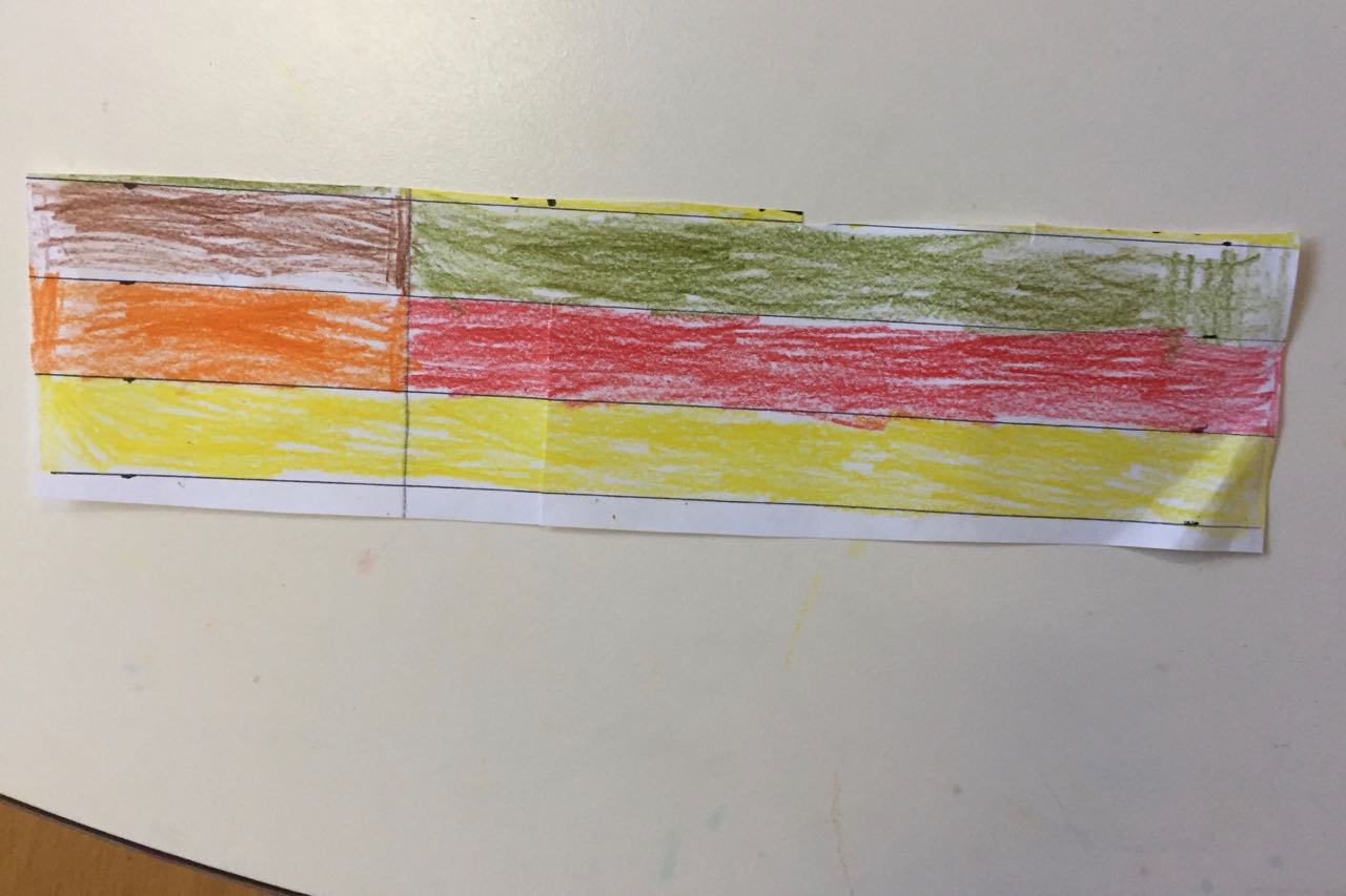 1. Il bambino colora con le matite colorate (gialle, rosse, verdi, arancioni, marroni) delle strisce (altezza 2cm., lunghezza 21cm.), tracciate su un foglio bianco.