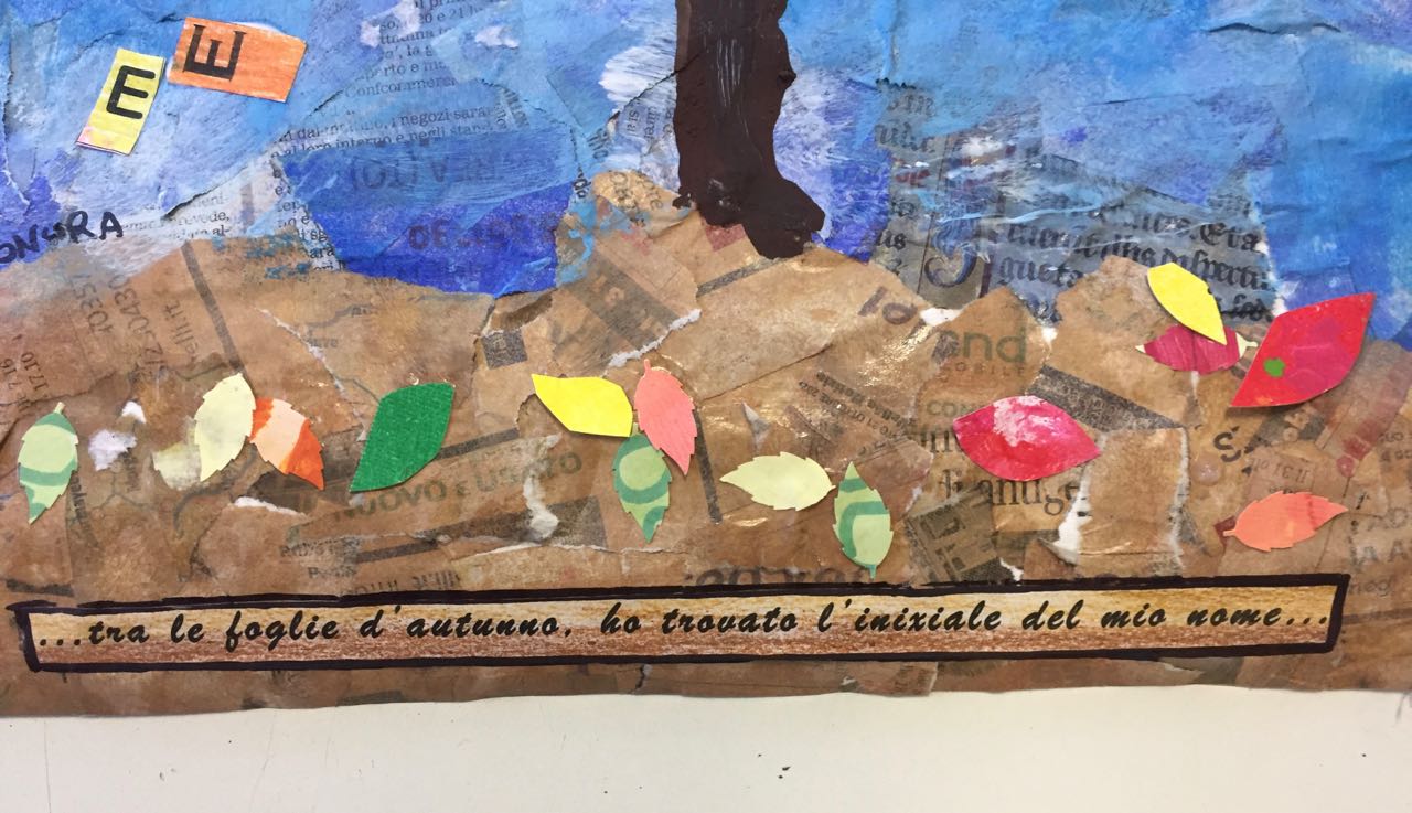 5. Incolla la frase “…tra le foglie d’autunno, ho trovato l’iniziale del mio nome…” dopo averne colorato lo sfondo con la matita colorata marrone e ripassato il contorno con un pennarello nero.