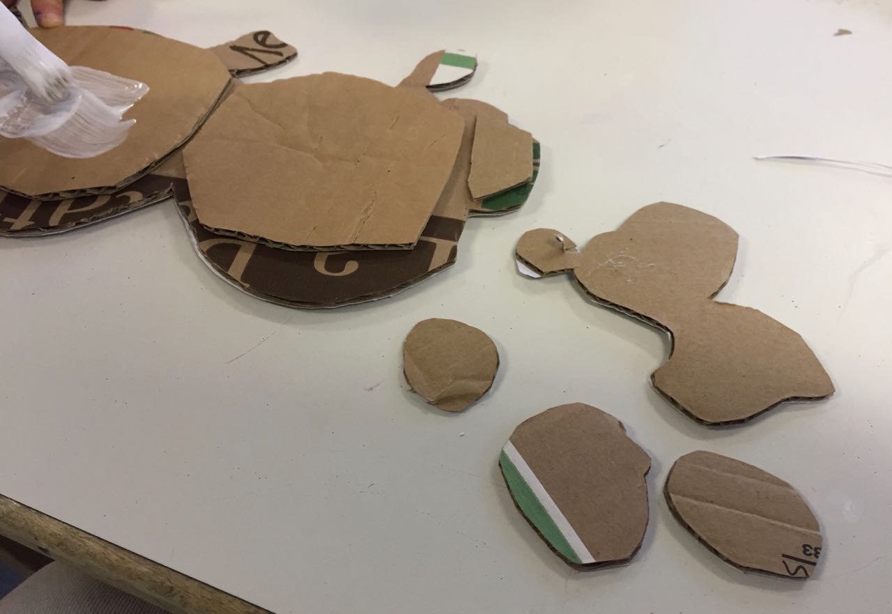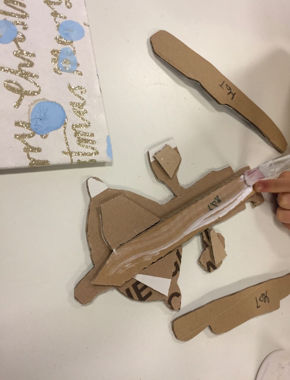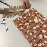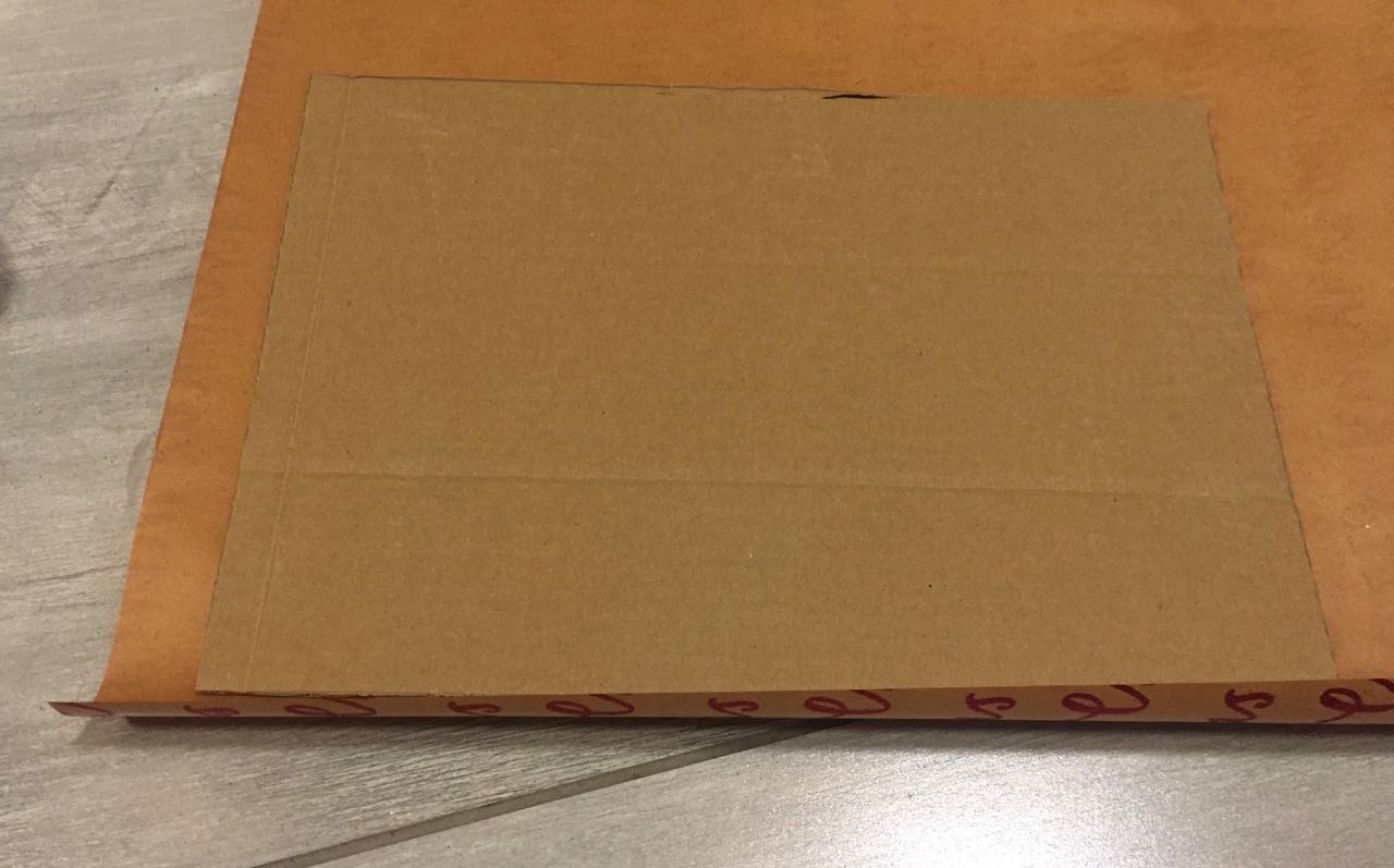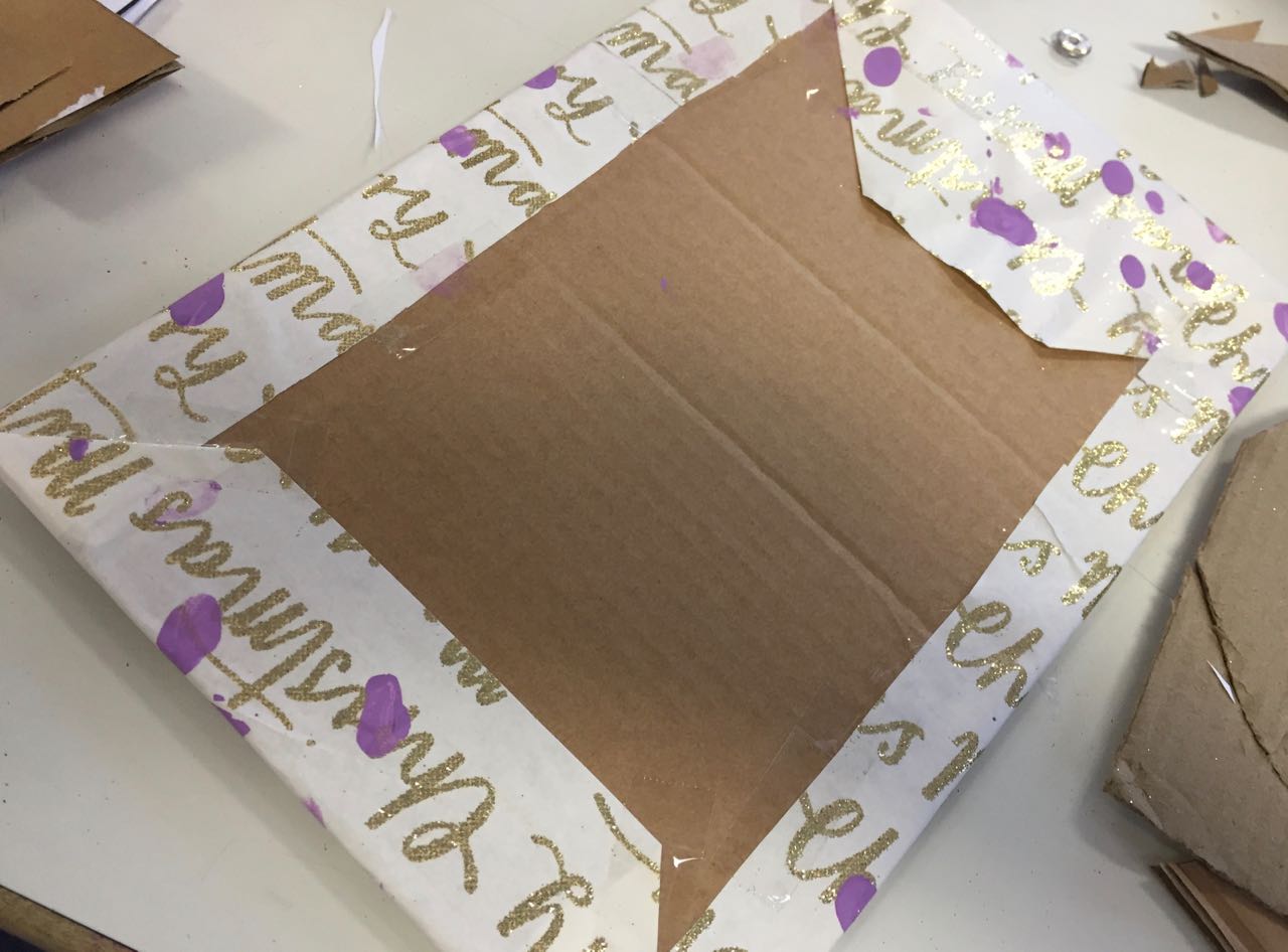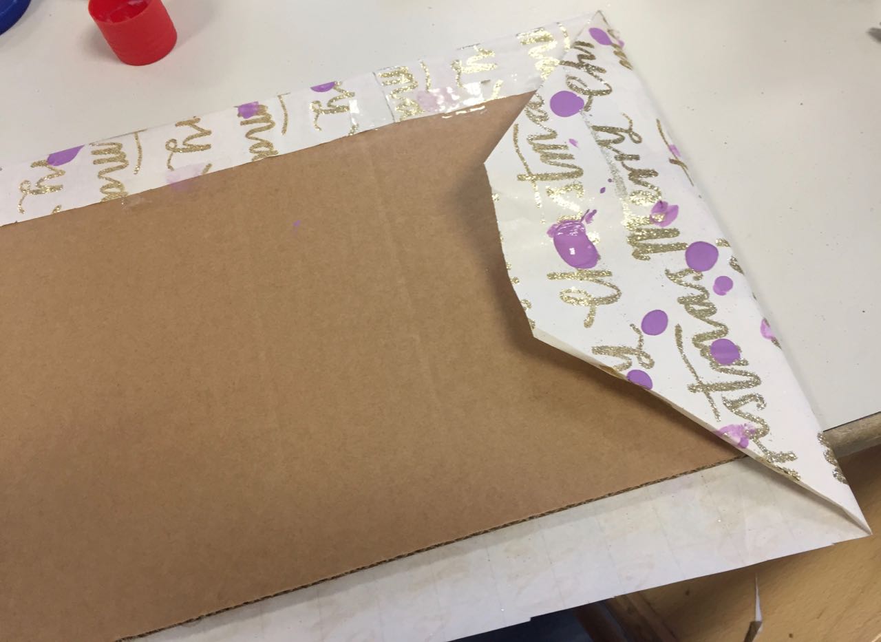 3. L’insegnante incolla la carta da pacco sul rettangolo di cartone spesso, lasciando tutto intorno un bordo di circa 4/5cm.