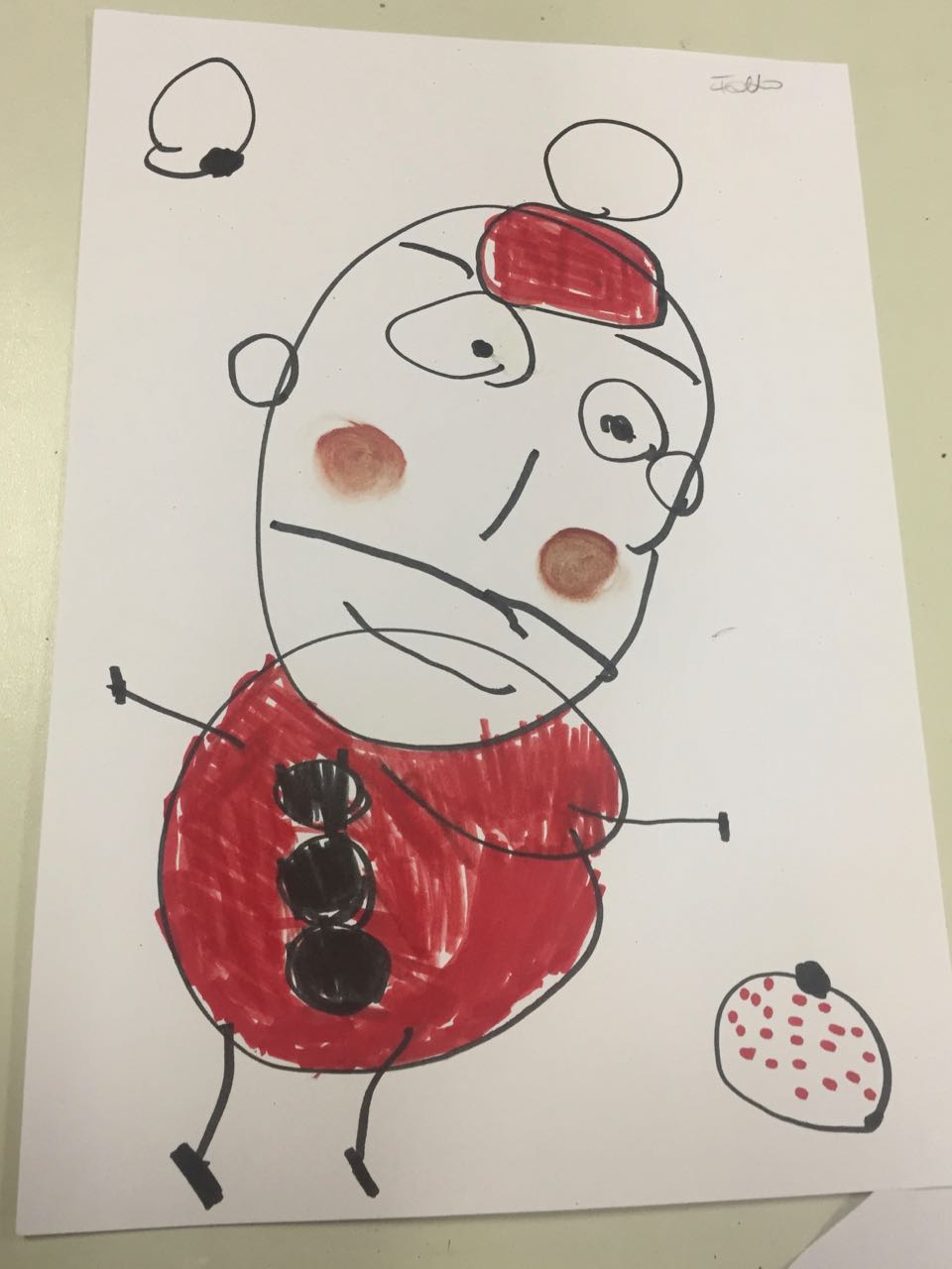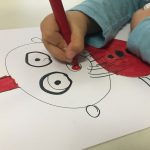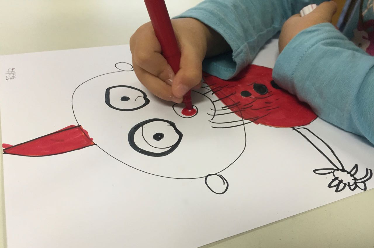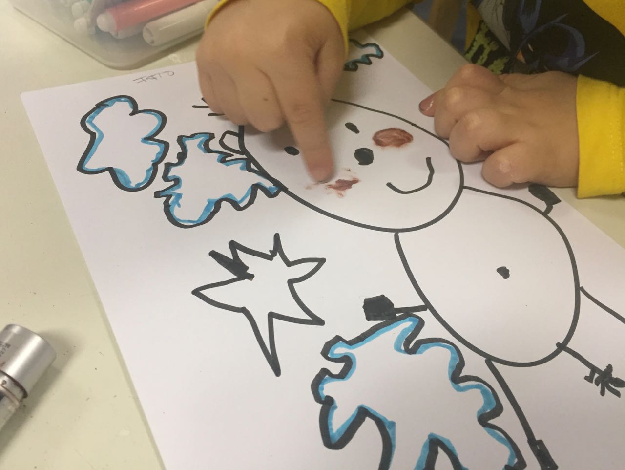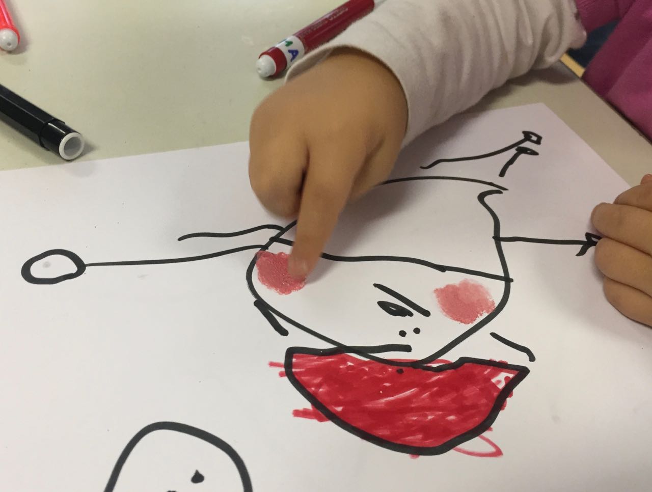 9. L’insegnante invita il bambino a colorare alcuni dettagli del suo disegno con un unico colore. (es. rosso il cappello di Babbo Natale, azzurro il bordo delle nuvole…)