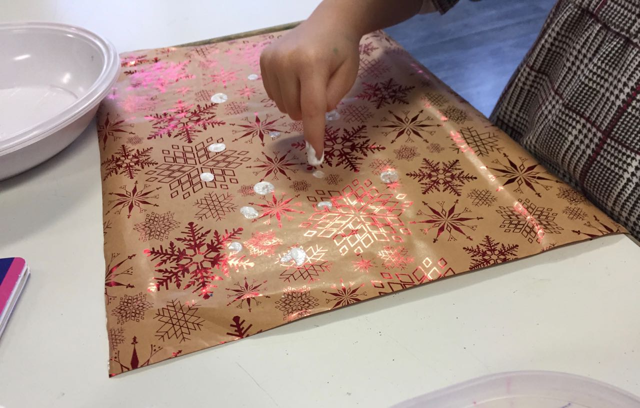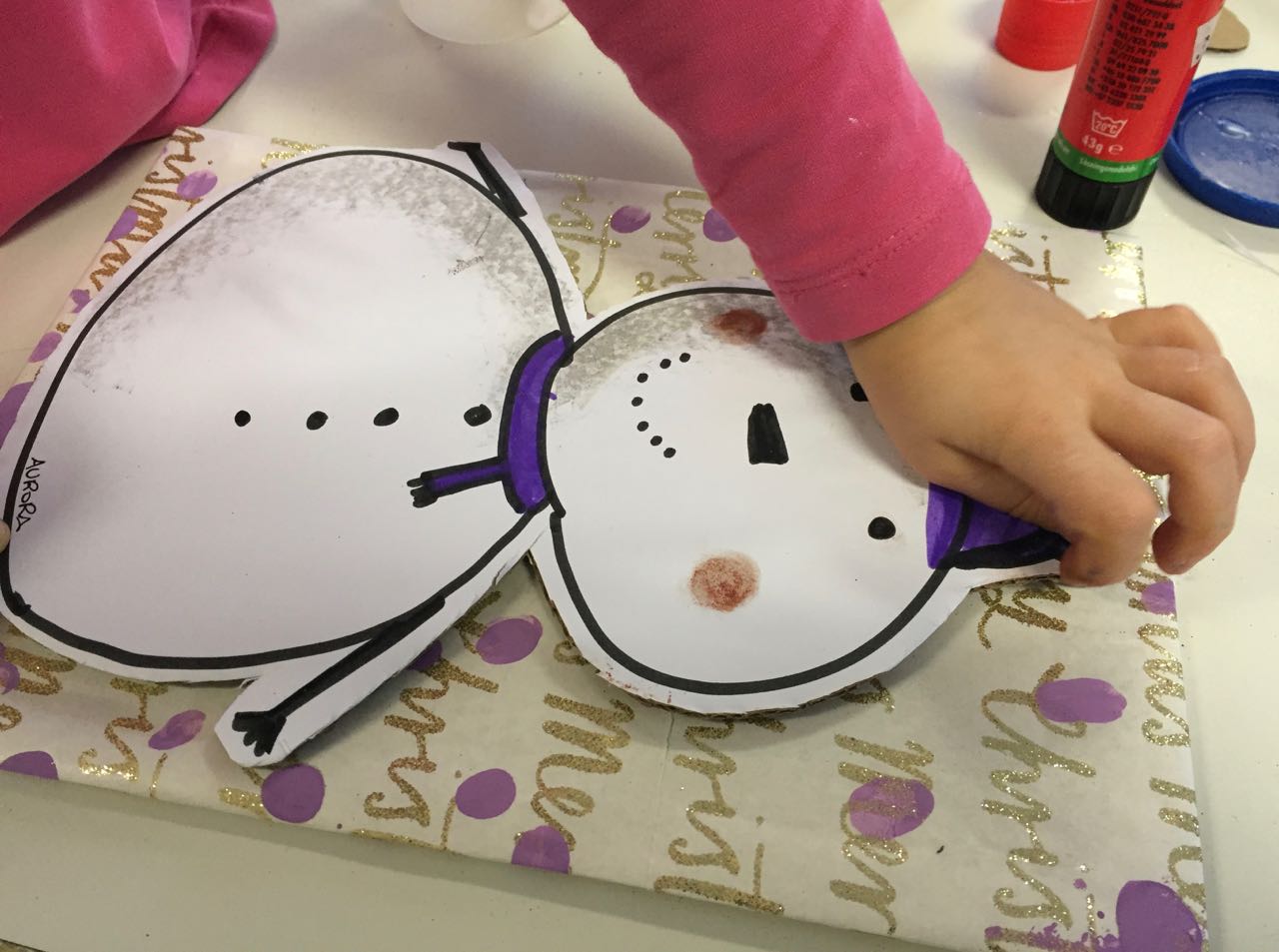 5. Il bambino pittura la neve sulla carta da pacco usando la tempera bianca o colorata se la carta da pacco di base è di colore bianca.