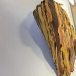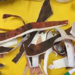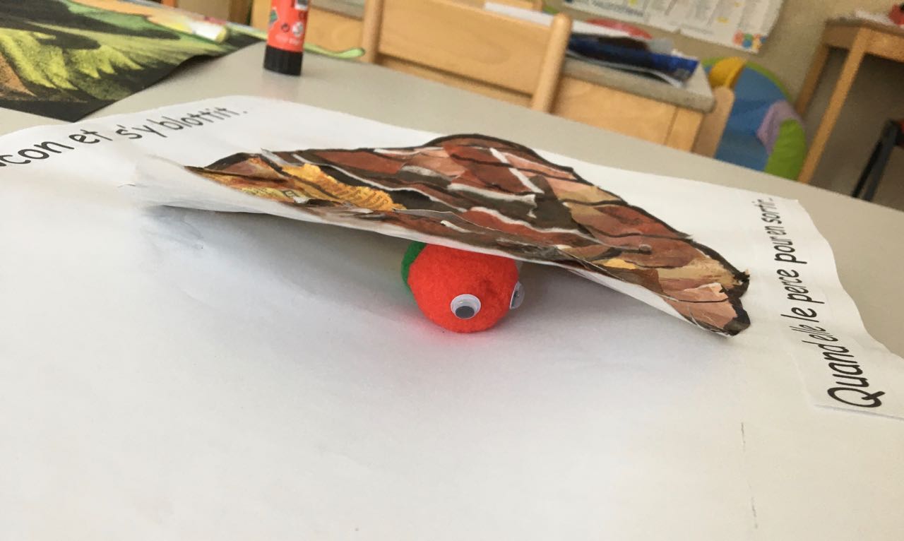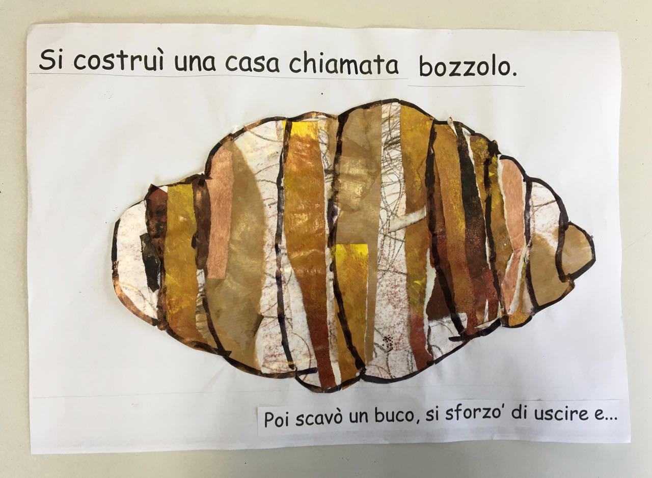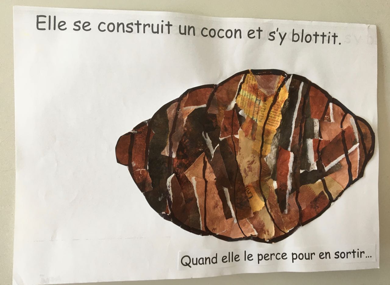 1. L’enfant colle des bandes de papier marron foncé/marron claire sur le cocon.