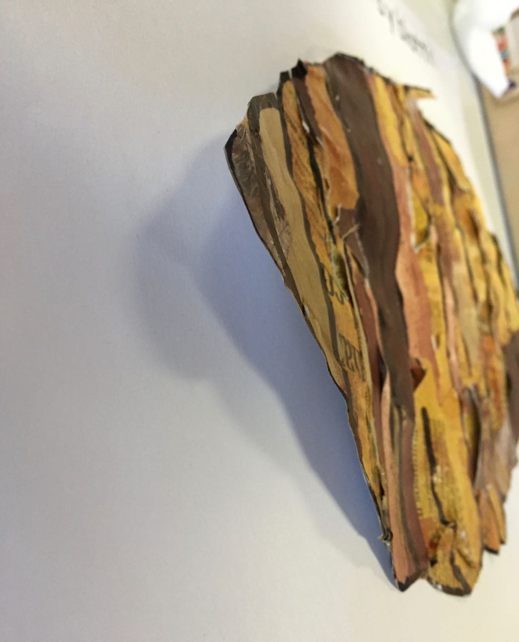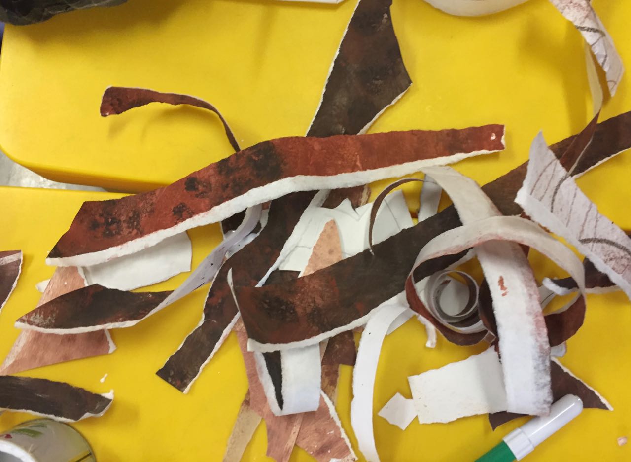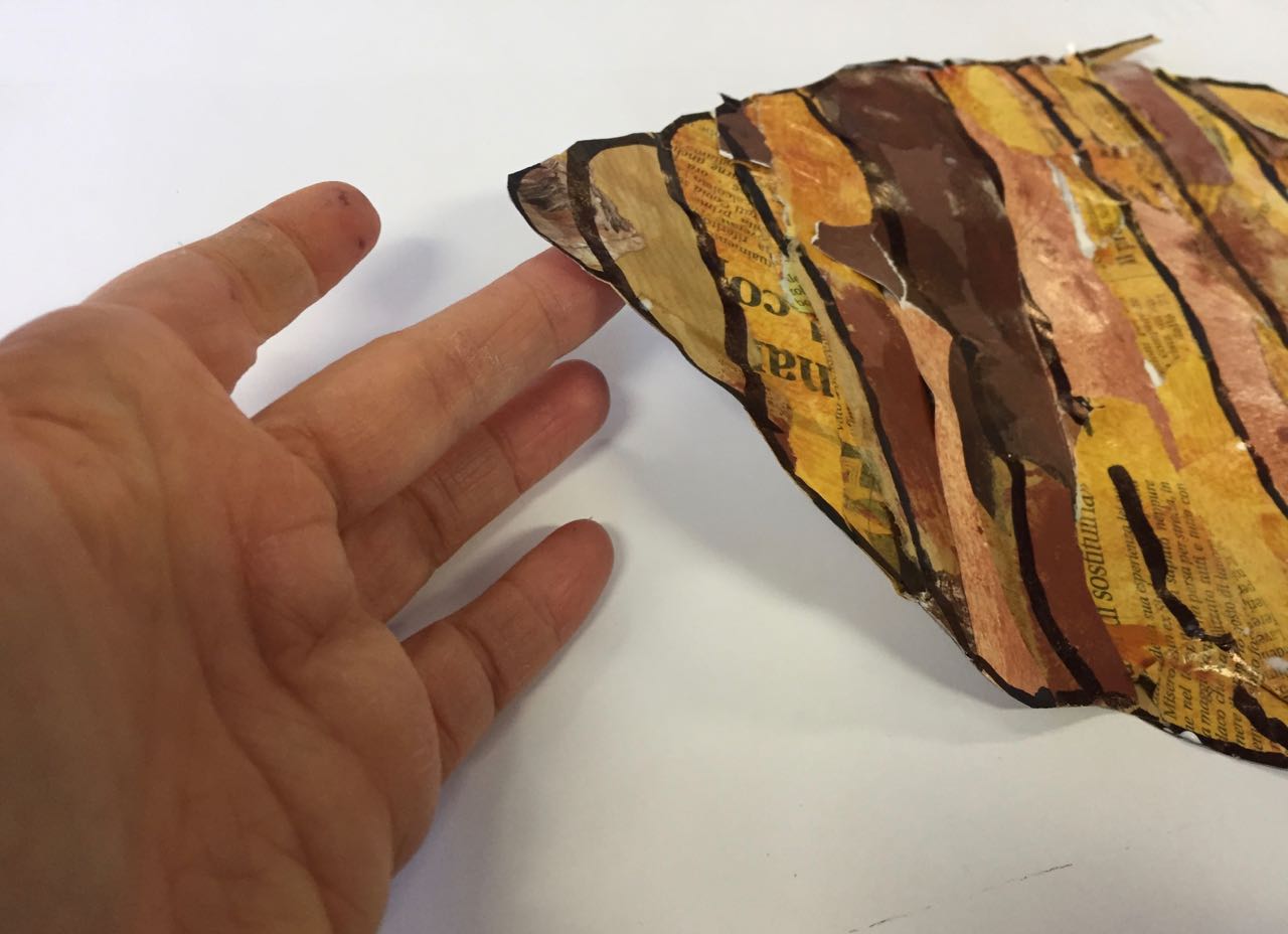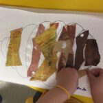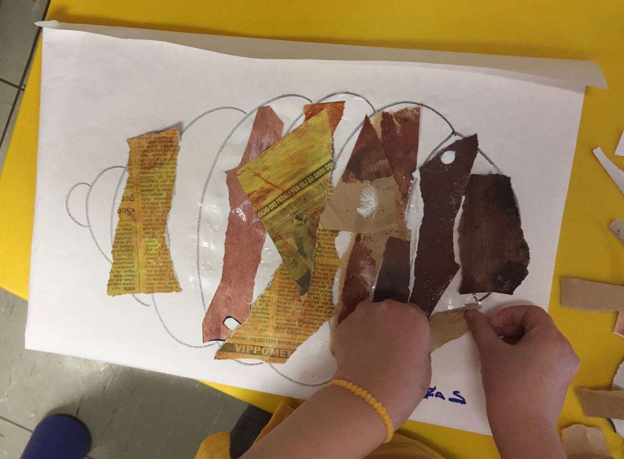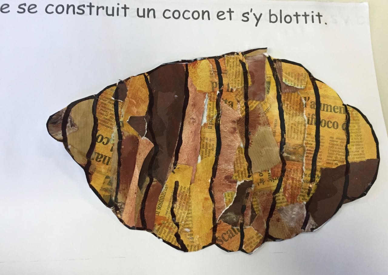 1. L’enfant colle des bandes de papier marron foncé/marron claire sur le cocon.