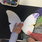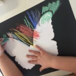 L’enfant trace le vol du papillon avec un marqueur permanent blanc.