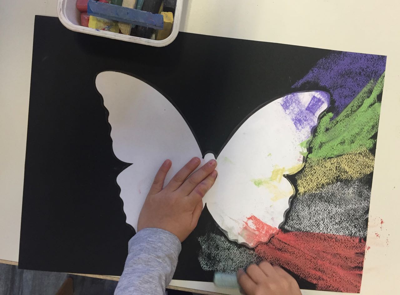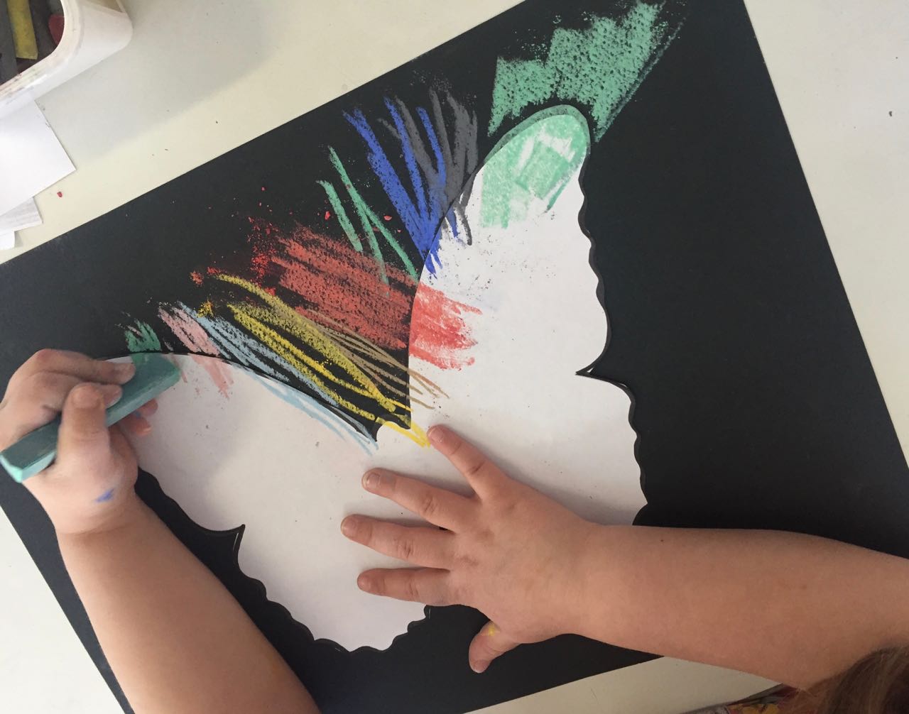L’enfant trace le vol du papillon avec un marqueur permanent blanc.