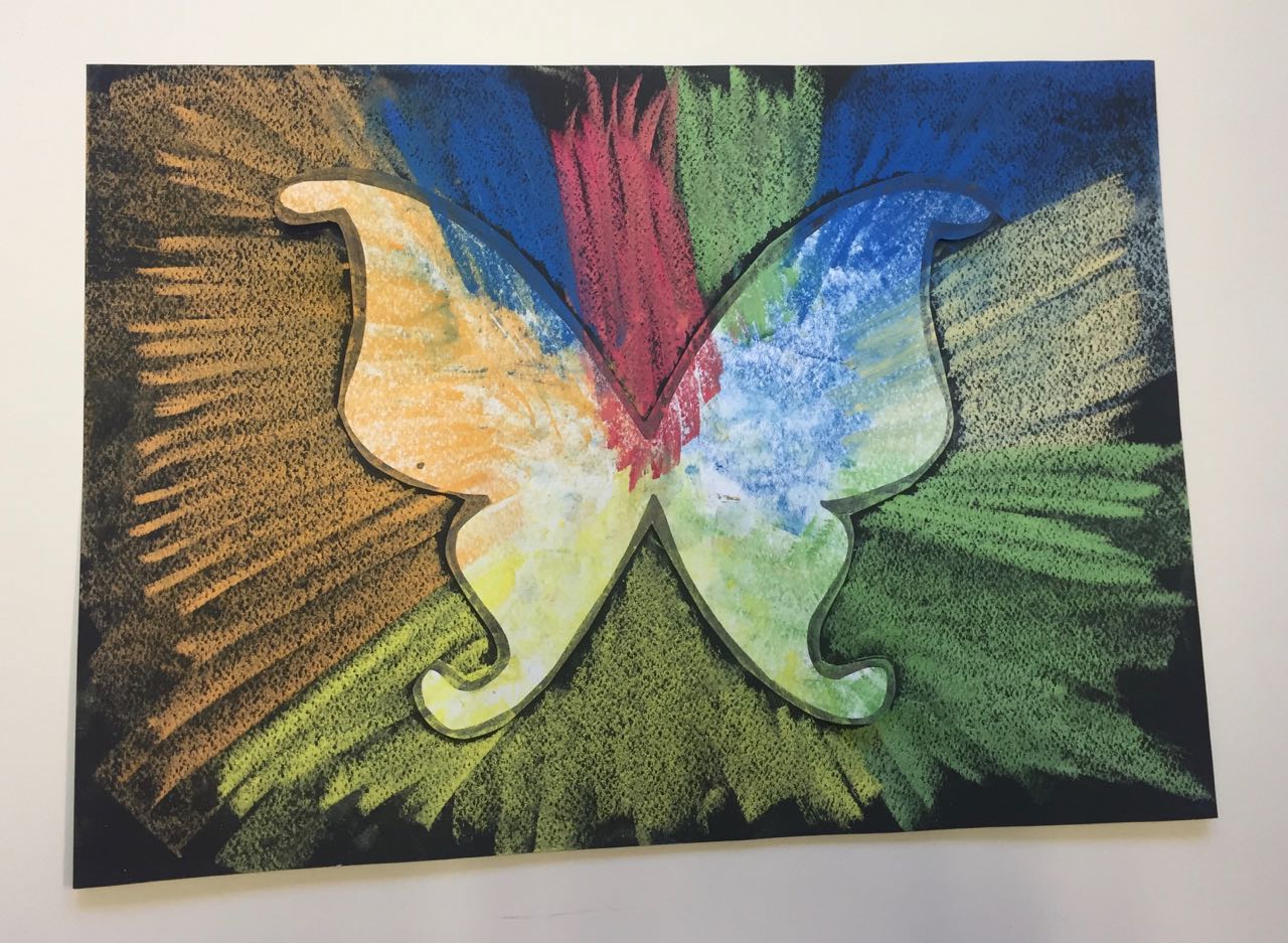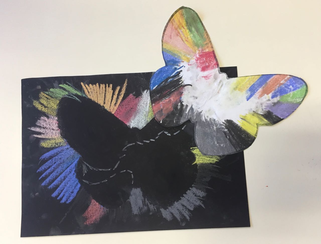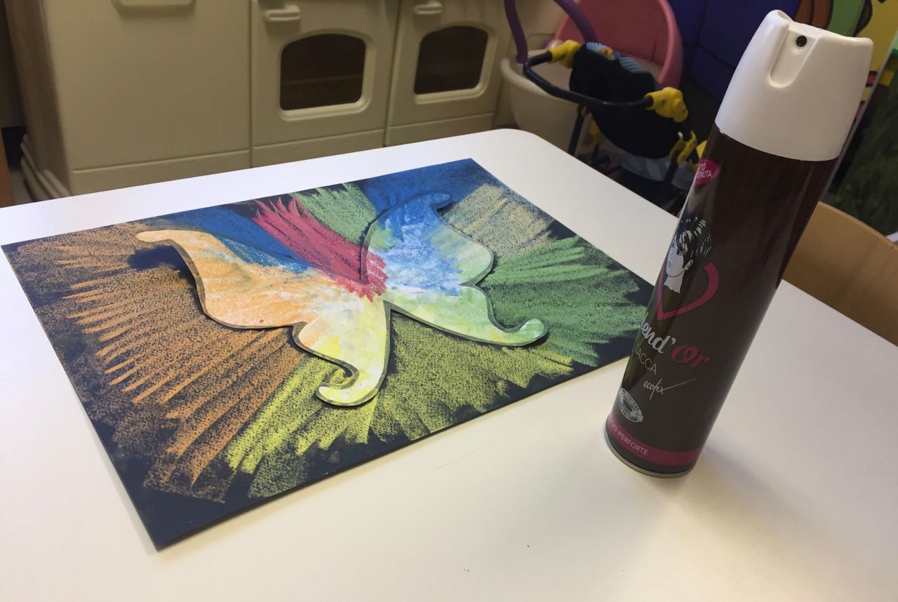 Attention: avant de détacher le papillon j’ai fixé la craie en vaporisant sur le papier de la laque pour cheveux.